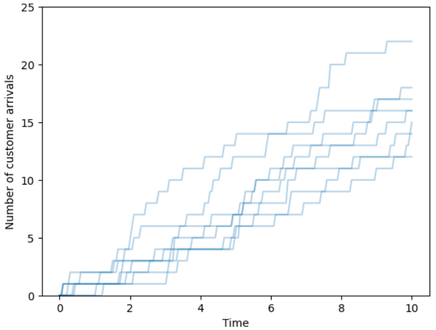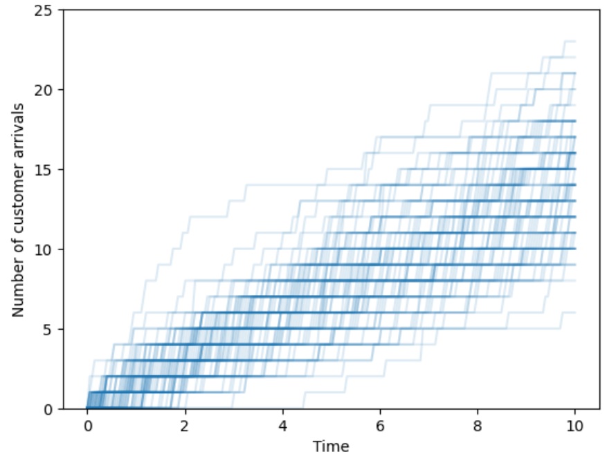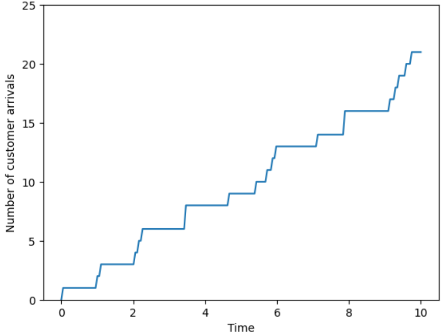 Arrivals over time. Customers enter a deli and take a number to mark their place in line. When the deli opens the counter starts 0; the first customer to arrive takes number 1, the second 2, etc. We record the counter over time, continuously, as it changes as customers arrive. We might be interested in the number of customers that arrive in some window of time, the time between customer arrivals, or the amount of time it takes for some number of customers to arrive. (And this is just the arrivals; we might also be interested in questions which involve the departures, such as: how much time a customer spends in the deli or how many customers are in the deli at a certain time.)