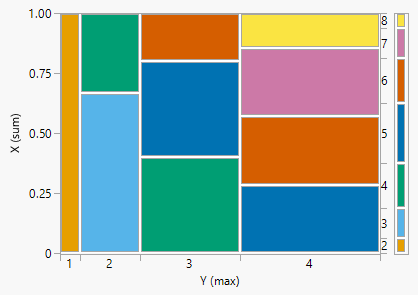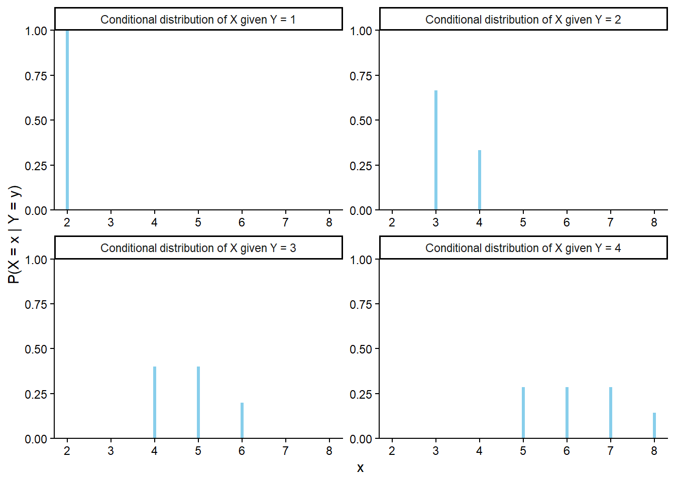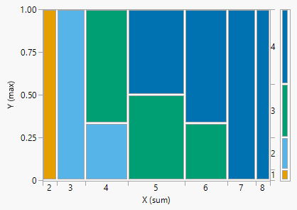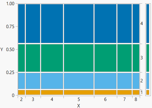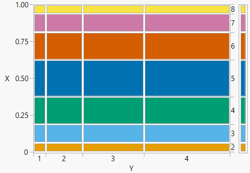Figure 2.28 displays mosaic plots of the distributions of the two independent discrete random variables of Example 2.68. Notice that the conditional distribution of \(X\) is the same for each value of \(Y\), and vice versa.
