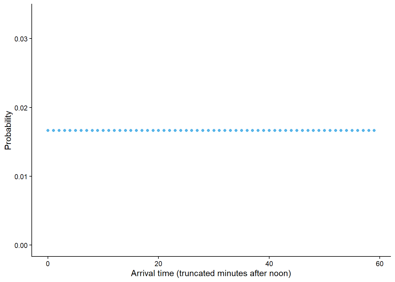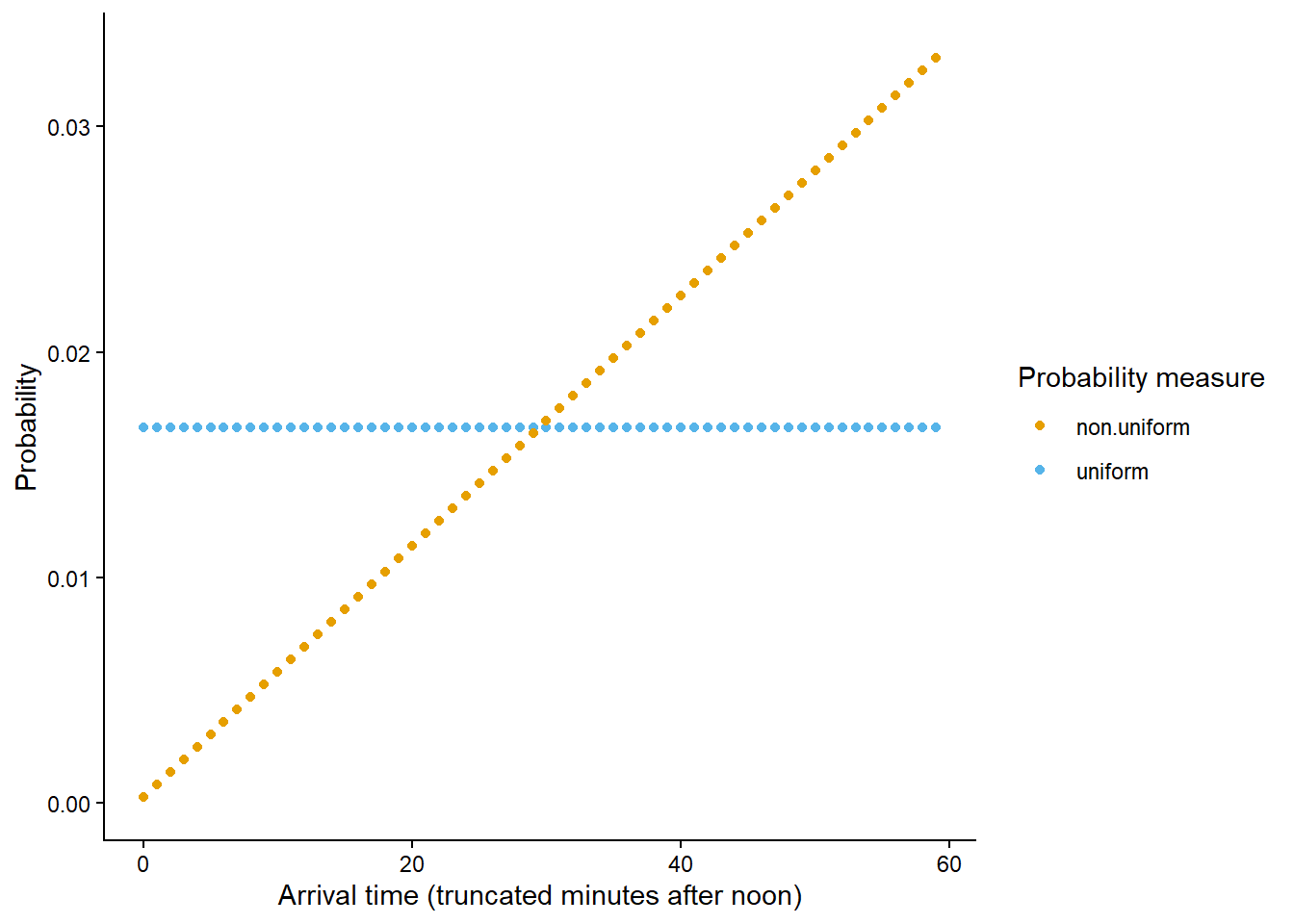 In the previous example, outcomes were measured on a continuous scale; any real number between 0 and 60 was a possible arrival time. In practice we might round the arrival time to the nearest minute or second, but in principle and with infinite precision any real number in the continuous interval \([0, 60]\) is possible.