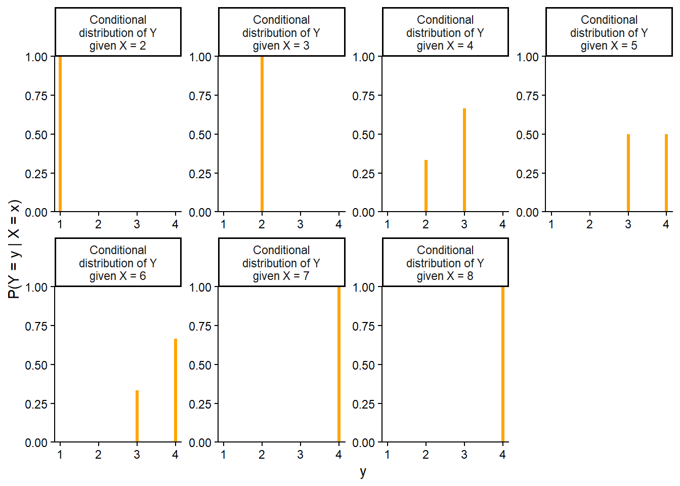 - The conditional distribution of \(X\) given the value of \(Y\) is equal to the marginal distribution of \(X\).