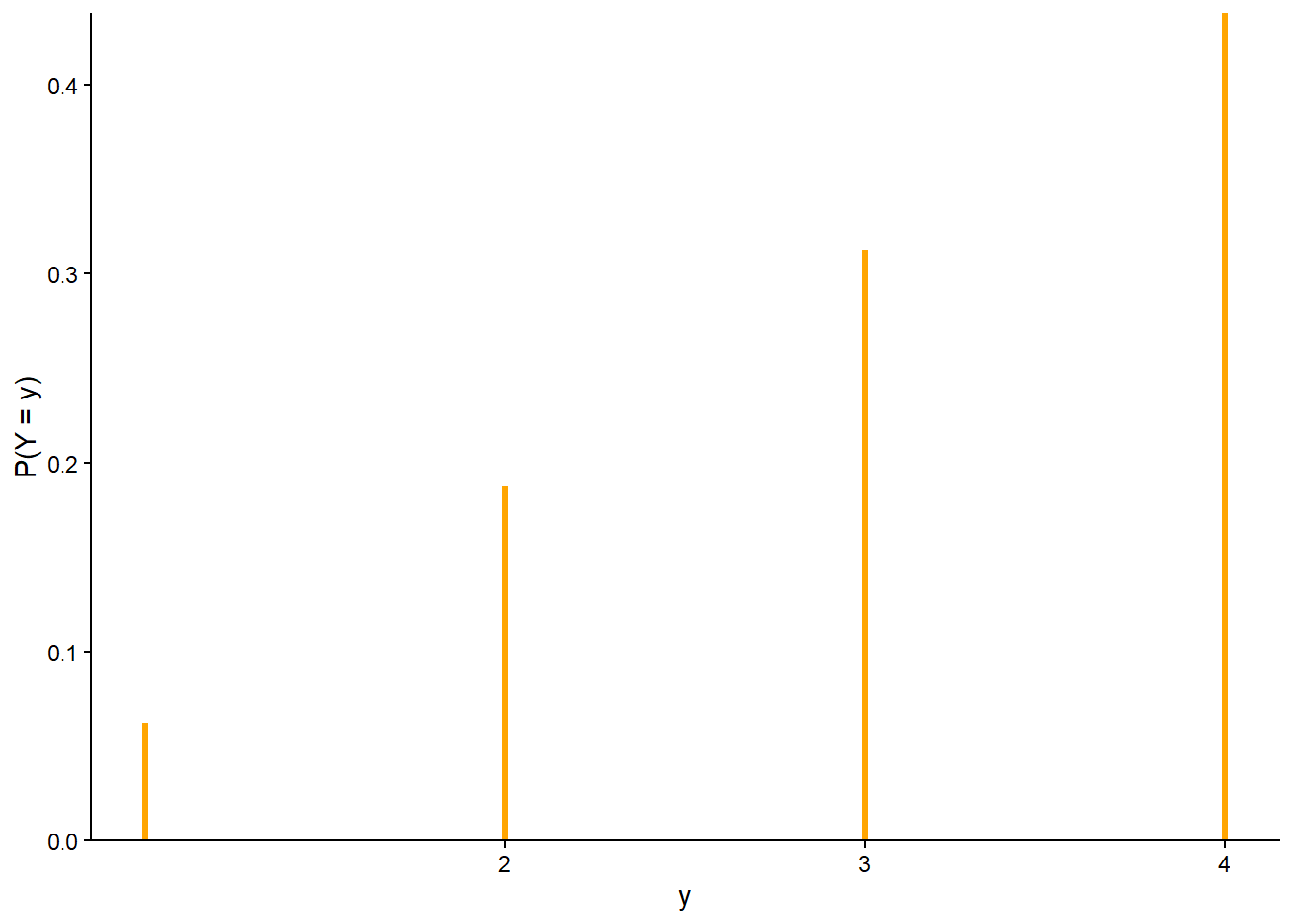 Probabilities are always defined for events (sets). When we say loosely “the probability of an outcome \(\omega\)” we really mean the probability of the event \(\{\omega\}\) consisting of the single outcome \(\omega\). In this example \(\textrm{P}(\{1\})=\textrm{P}(\{2\})=\textrm{P}(\{3\})=\textrm{P}(\{4\})=1/4\).↩︎