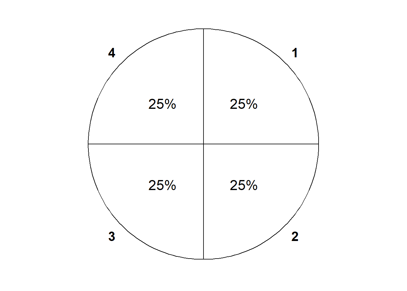 That the probability of each outcome must be 1/4 when there are four equally likely outcomes follows from the axioms, by writing \(\{1, 2, 3, 4\} = \{1\}\cup\{2\}\cup \{3\}\cup \{4\}\), a union of disjoint sets, and applying countable additivity and \(\textrm{P}(\Omega)=1\). But we don’t need this level of technical detail; our intuition tells us the probability of each four equally likely outcomes is 1/4.↩︎