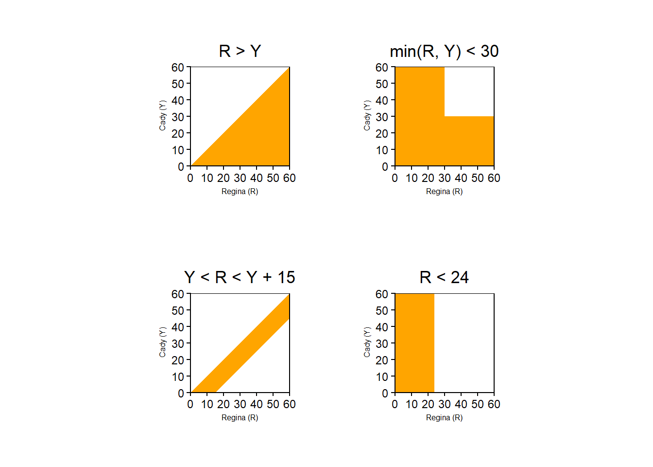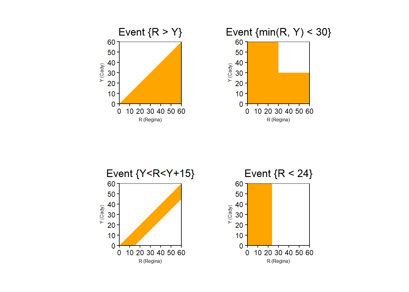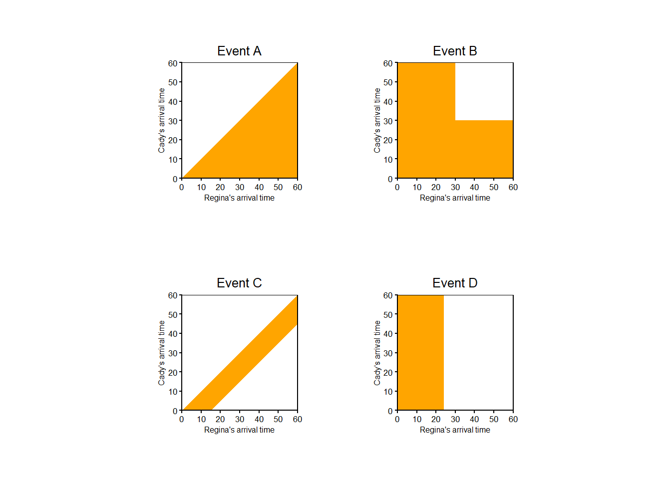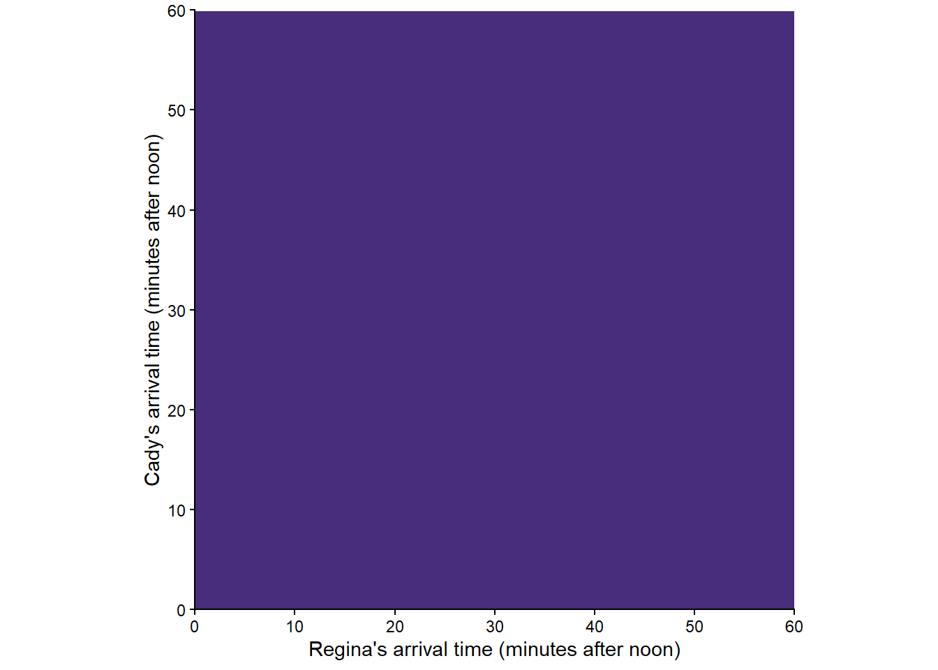 Mathematically we can write the sample space as \([0,60]\times [0,60]=[0,60]^2\), the Cartesian product \(\{(x, y): x \in [0, 60], y \in [0, 60]\}\), the set of ordered pairs whose components take values in \([0, 60]\).↩︎