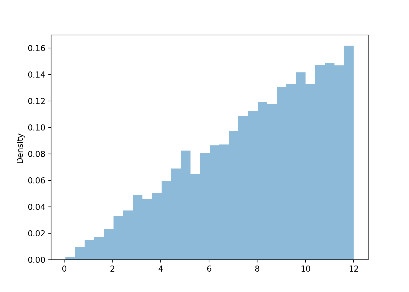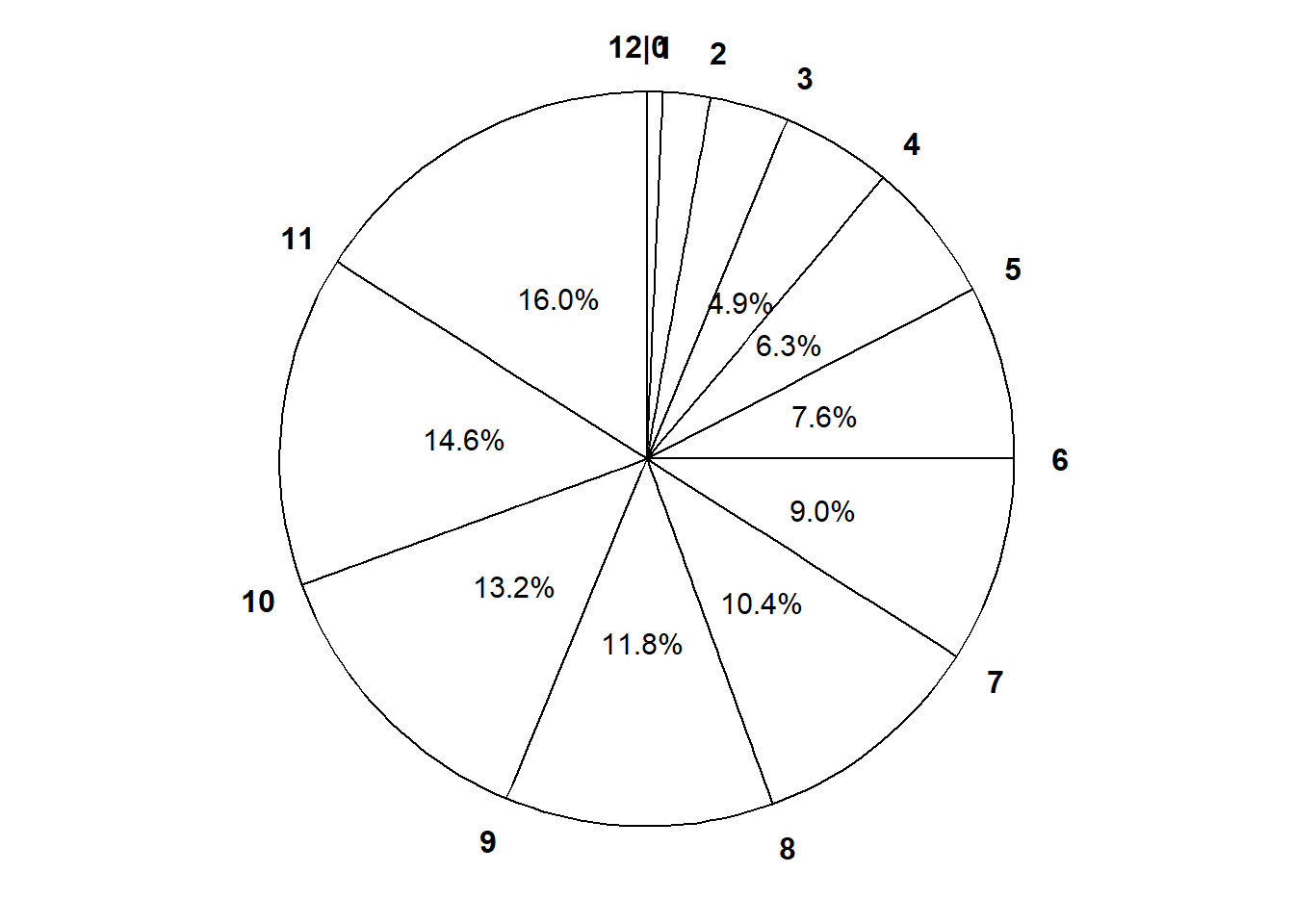 - Exercise 2.13 shows that \(R\) is not uniformly distributed between 0 and 12. In particular, \(R\) is more likely to be between 11 and 12 than it is to be between 0 and 1. Therefore a Uniform(0, 12) spinner would not be appropriate.