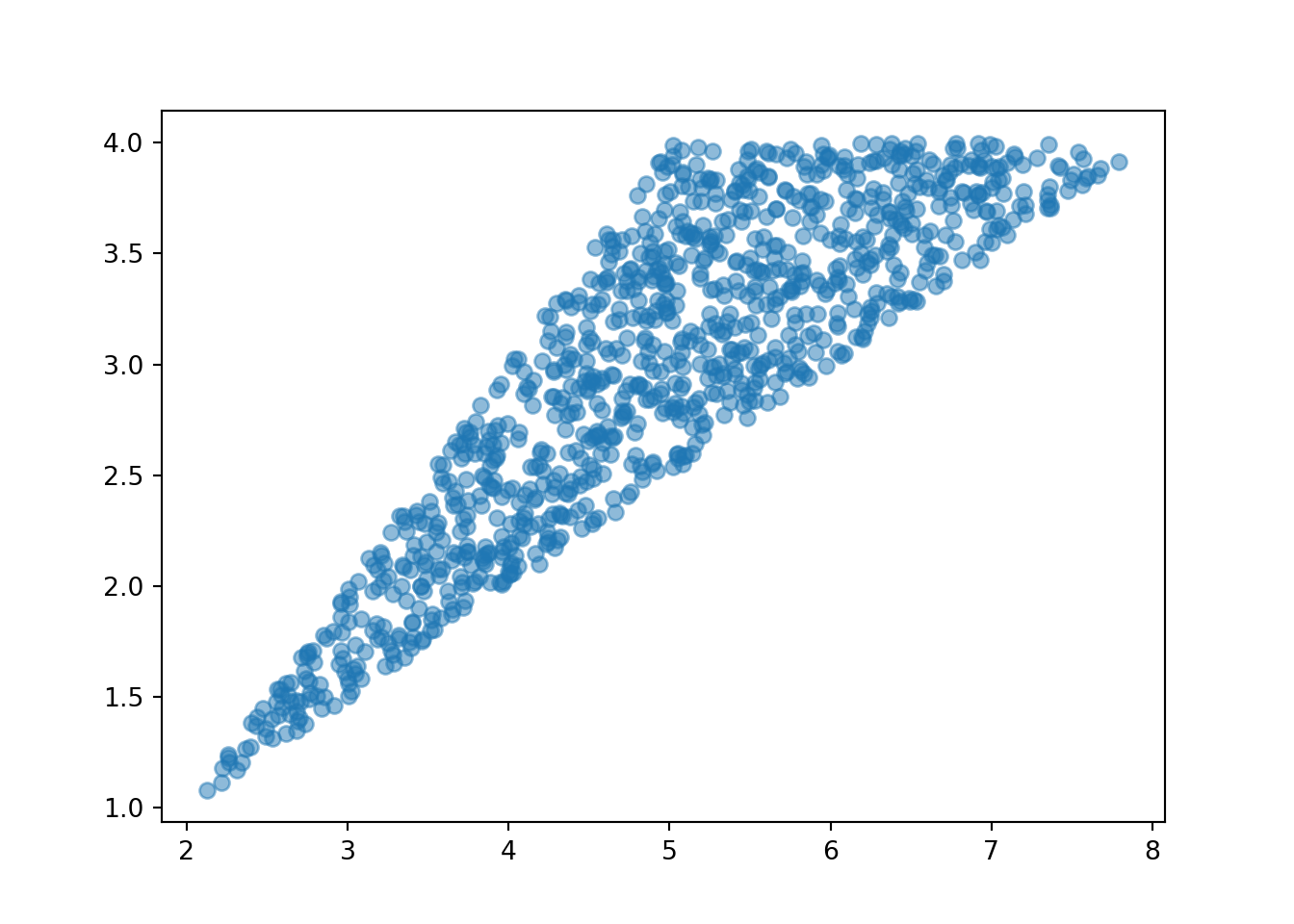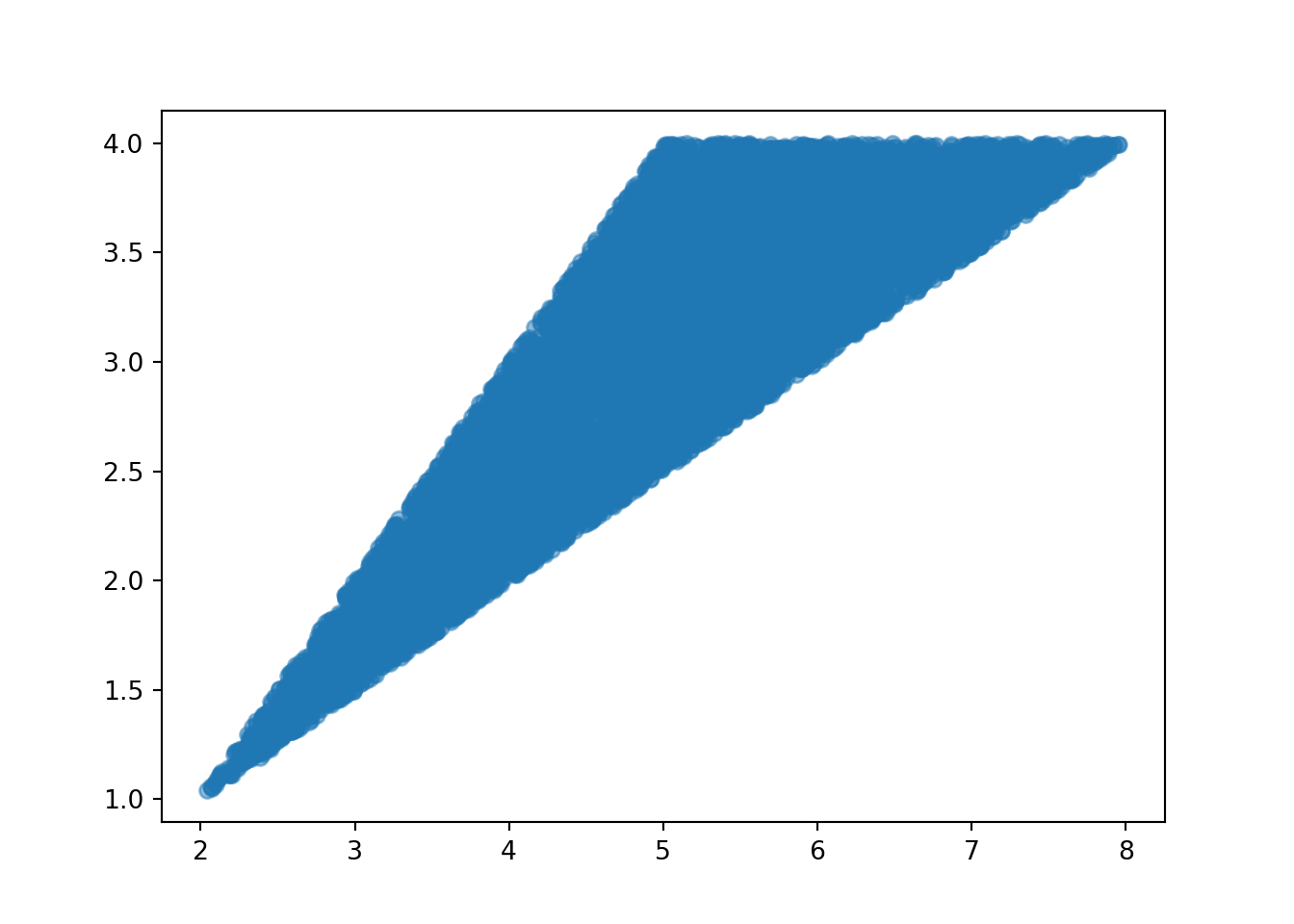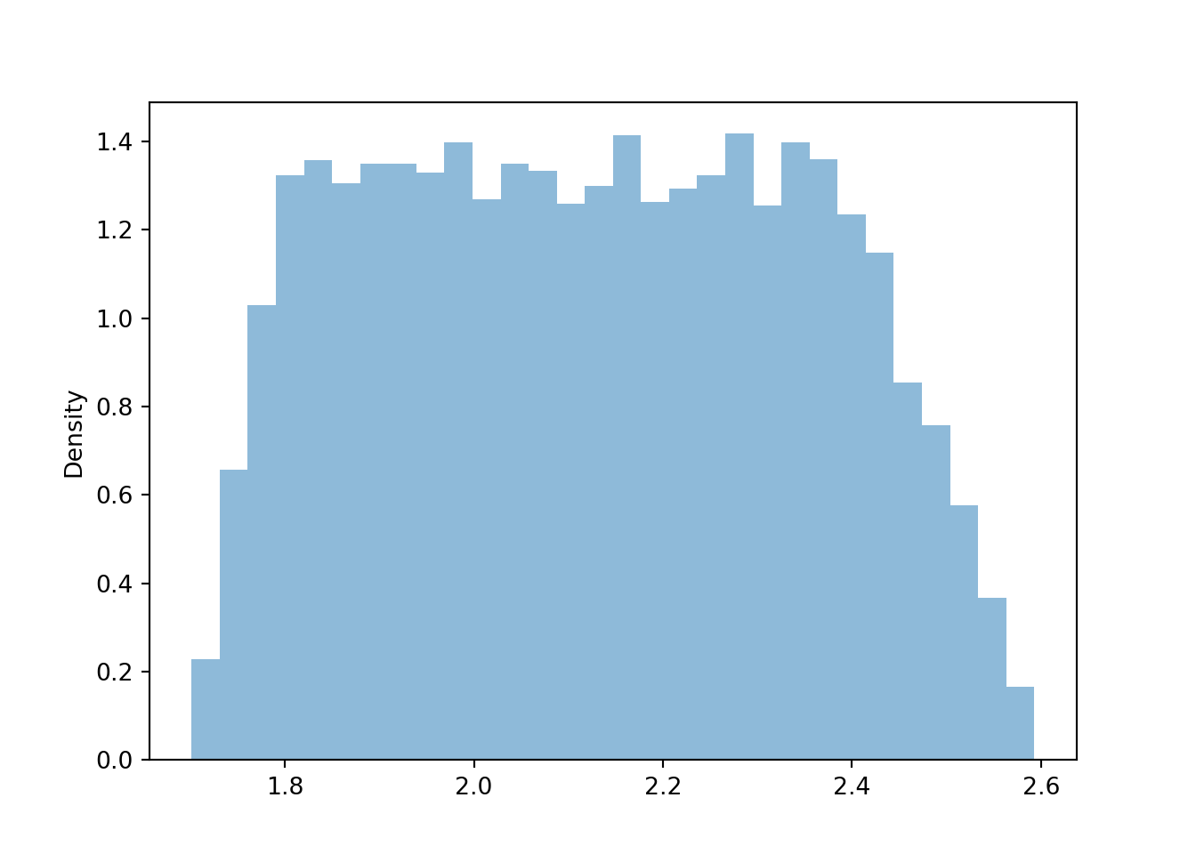 The true conditional distribution of \(Y\) given \(X=3.5\) is Uniform(1.75, 2.5). We see that the approximate distribution is a little rough at the boundaries (near 1.75 and 2.5), because of the “close to 3.5” approximation. But we would not be able to simulate the conditional distribution given \(X=3.5\) without more sophisticated methods.