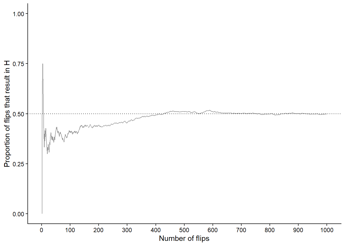 We might all agree2 that the probability that a single flip of a fair coin lands on heads is 1/2, a.k.a., 0.5, a.k.a, 50%. There are only two outcomes, heads (H) and tails (T), and the notion of “fairness” implies that they should be equally likely, so we have a “50/50 chance” of heads. But how else can we interpret this 50%? As in the dice rolling problem, we can consider what would happen if we flipped the coin many times. Now, if we flipped the coin twice, we wouldn’t expect to necessarily see one head and one tail. But in many flips, we might expect to see heads on something close to 50% of flips.