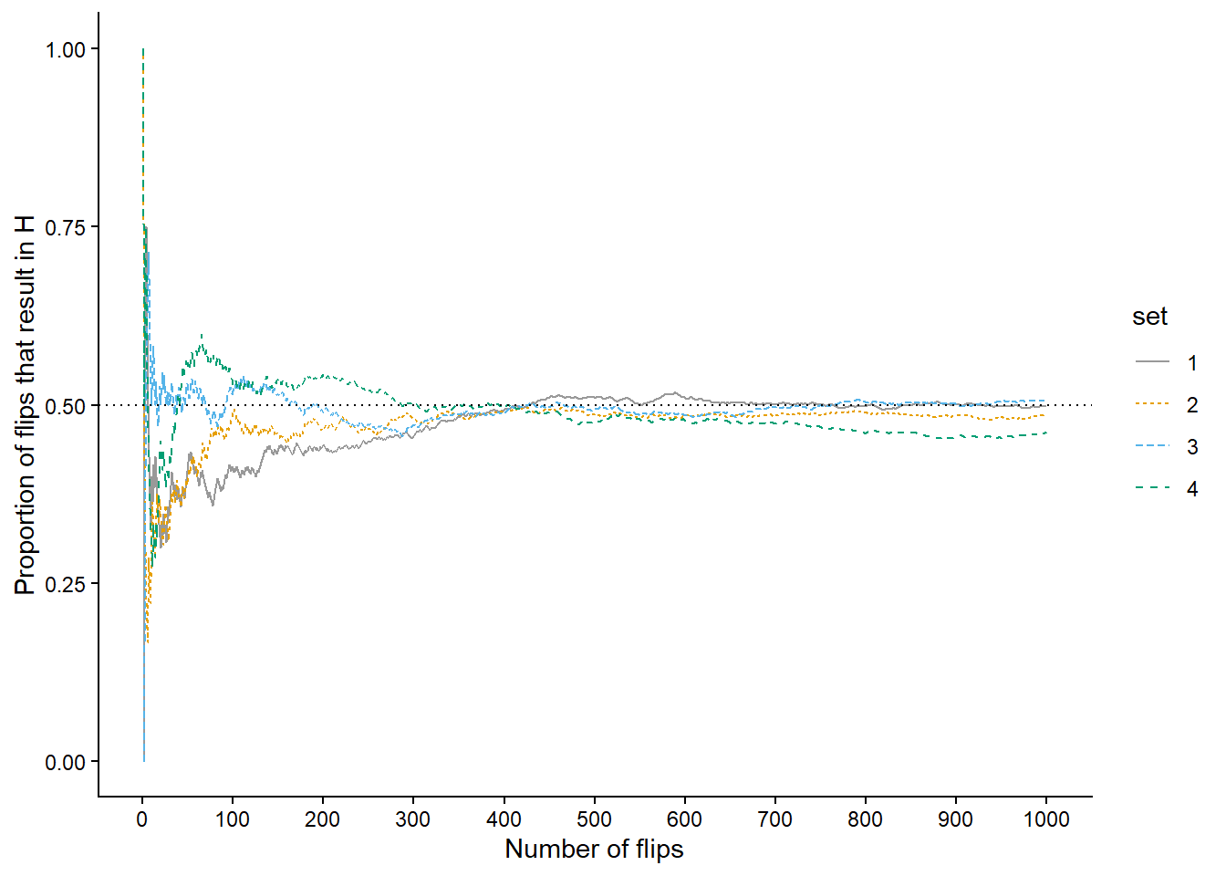 Now we’ll flip the coin 900 more times for a total of 1000 flips in each of the four sets. Figure 1.4 (a) displays the results, while Figure 1.4 (b) also displays the results for 3 additional sets of 1000 flips. Again, the running proportion fluctuates considerably in the early stages, but settles down and tends to get closer to 0.5 as the number of flips increases. Compared to the results after 100 flips, there is less variability between sets in the proportion of H after 1000 flips: 0.498 (gray), 0.485 (orange), 0.506 (blue), 0.462 (green). Now, even after 1000 flips the proportion of flips that result in H isn’t guaranteed to be exactly 0.5, but we see a tendency for the proportion to get closer to 0.5 as the number of flips increases.