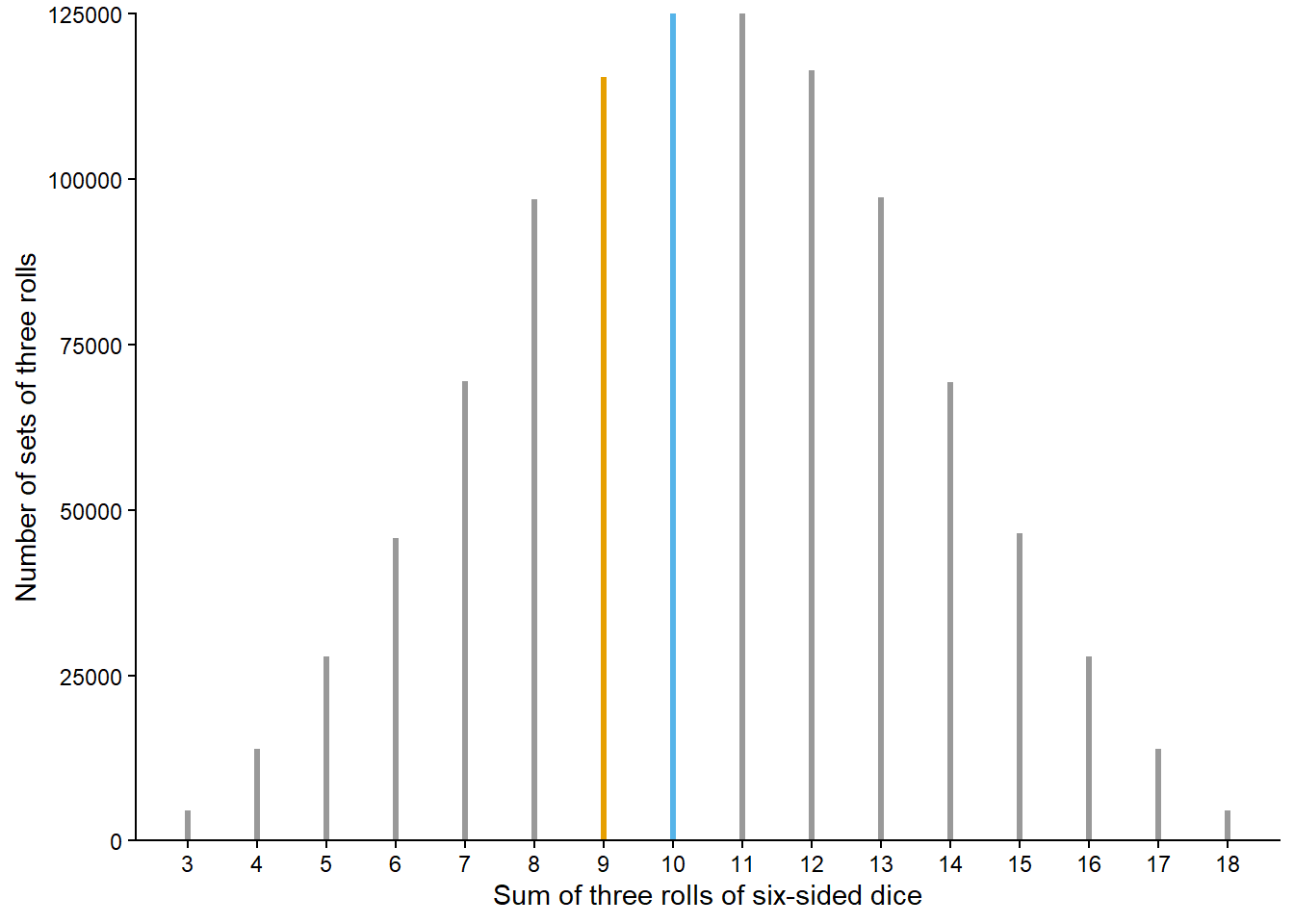 Finally, recall that contrary to colloquial uses of the word, random does not mean haphazard. Individual outcomes of a random phenomenon are uncertain, but the long run relative frequency interpretation implies a predictable pattern over a large number of (usually hypothetical) repetitions. For example, Figure 1.1 displays a clear distribution of the sum of the rolls of three fair six-sided dice after one million repetitions of the phenomenon. We don’t know what the sum will be when we roll the dice, but we can say that it’s equally likely to be 10 or 11, more likely to be 10 than 9, more likely to be 9 than 8, and so on. Also, we know that if we roll the dice many times, close to 12.5% of sets of three rolls will result in a sum of 10.