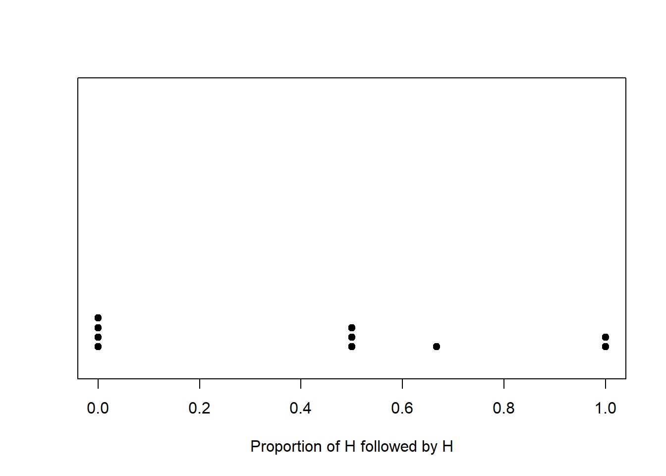 We can keep repeating the above process to investigate what happens in the long run. Rather than actually flipping coins, we use a computer to run a simulation. Figure 1.13 summarizes the results of 1,000,000 successful repetitions of the simulation, after discarding the sequences with no flips following H. (We will see how to program, run, and summarize simulations like this in later chapters.) While you can’t see the individual “dots” like in Figure 1.12 each dot would represent a sequence of 4 coin flips (with at least one flip following a H) and the value being plotted is the proportion of H followed by H for that sequence. The results would look like those in Table 1.4, albeit a table with 1,000,000 rows (after discarding rows with no flips immediately following H.)