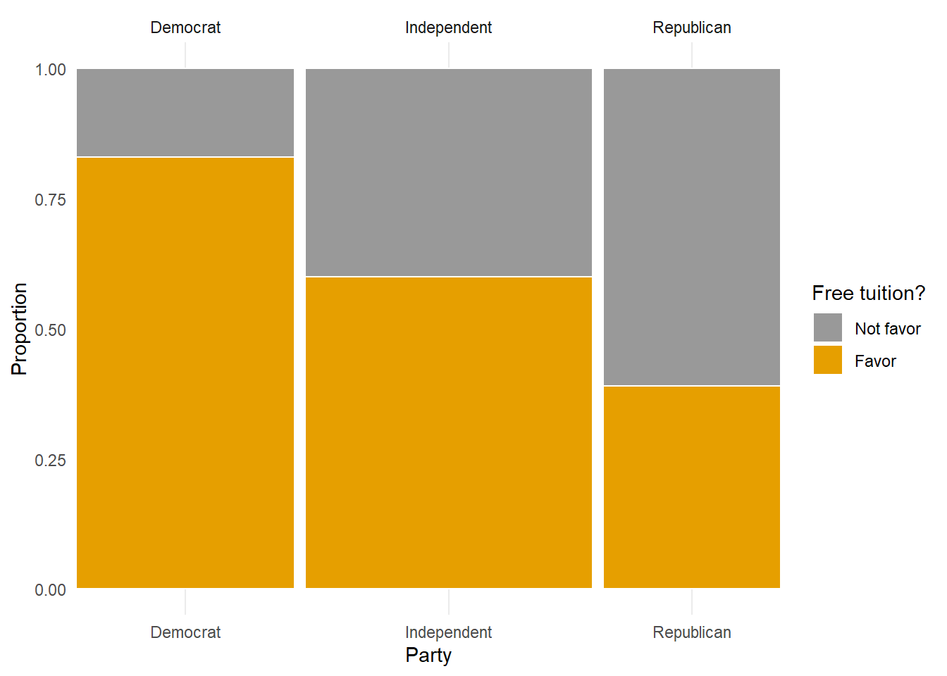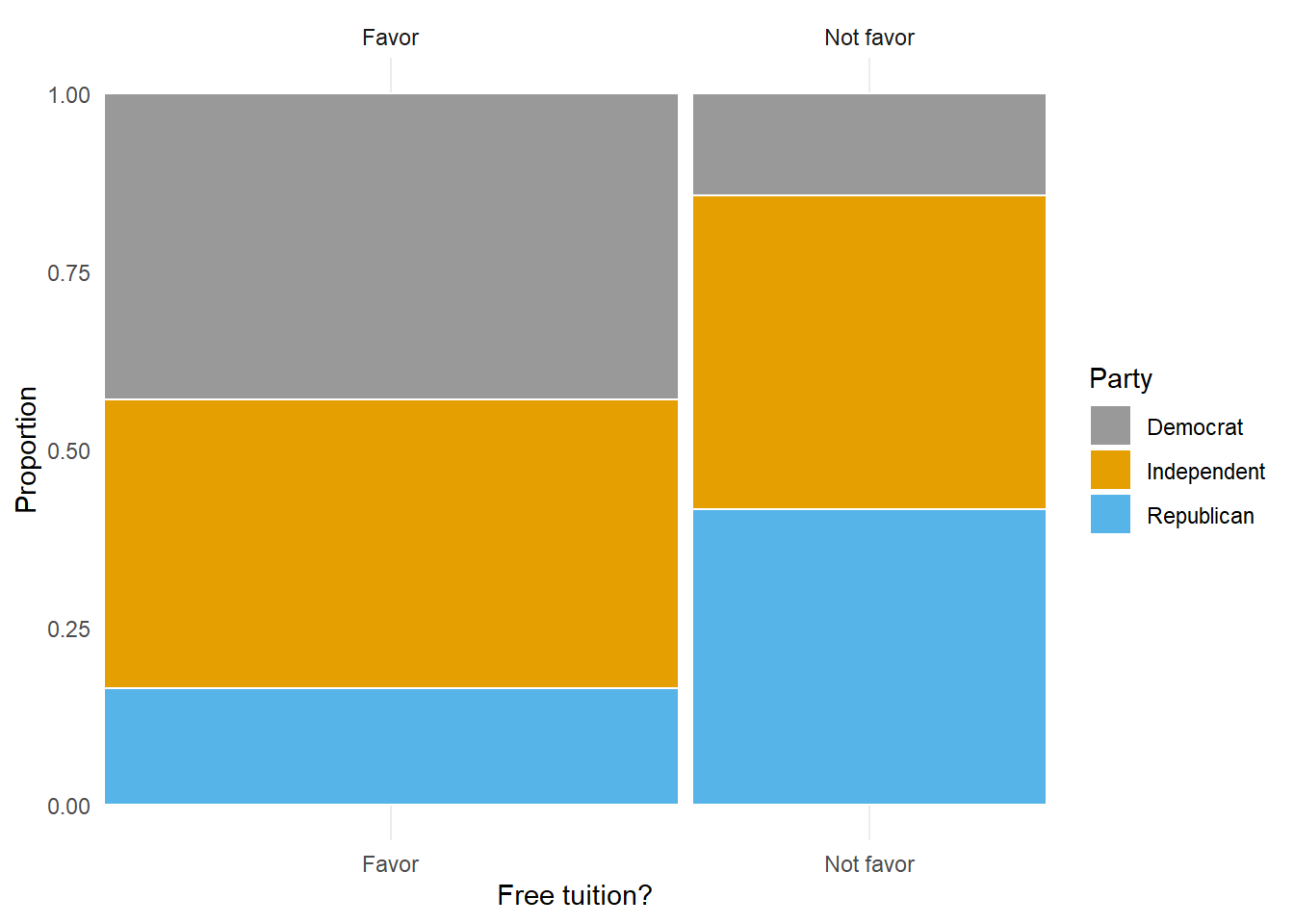 Careful: we are only claiming that the total does not matter when constructing hypothetical tables. When collecting real data, the sample size matters a great deal. For example, a random sample of 1000 Americans provides a more precise estimate of the population proportion of all Americans who support free tuition than a sample of 100 Americans does. The Pew Research study was based on a random sample of over 12000 Americans.↩︎