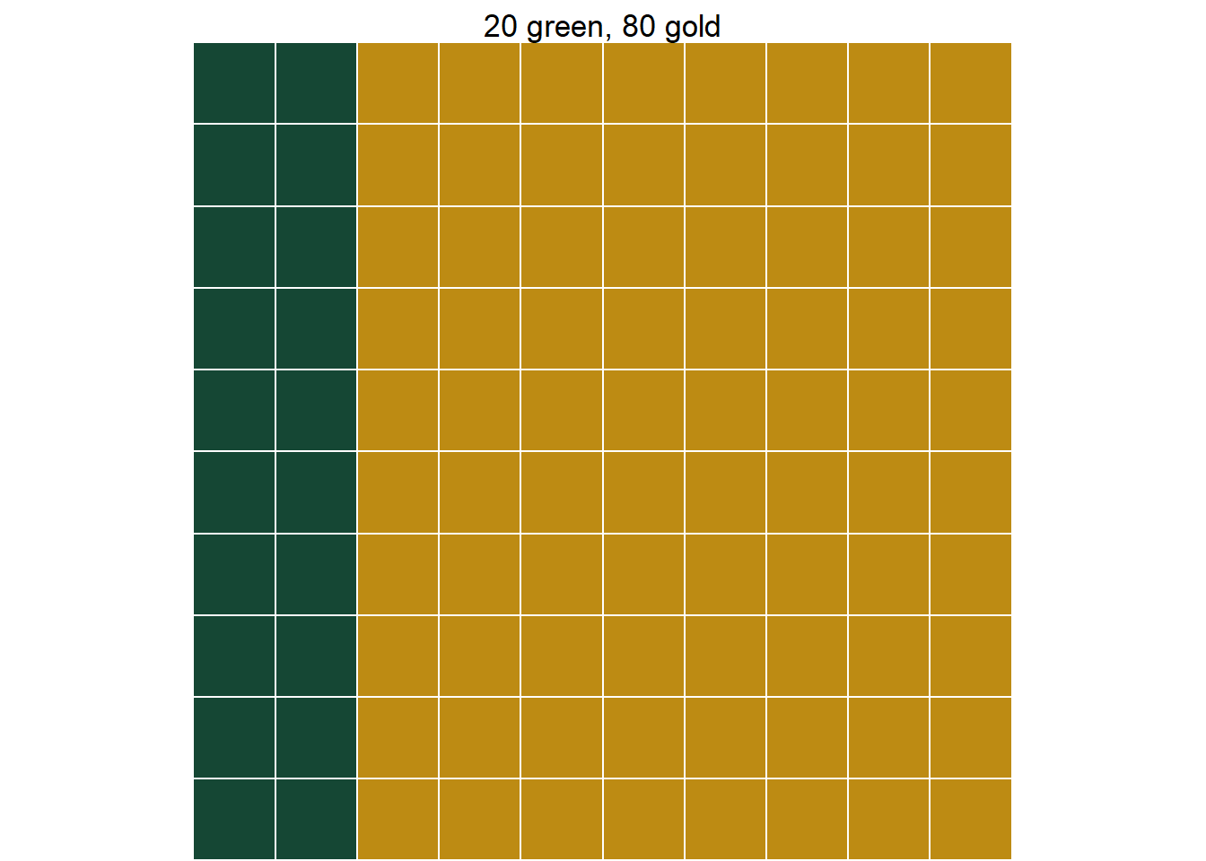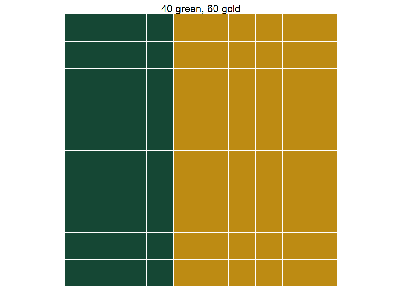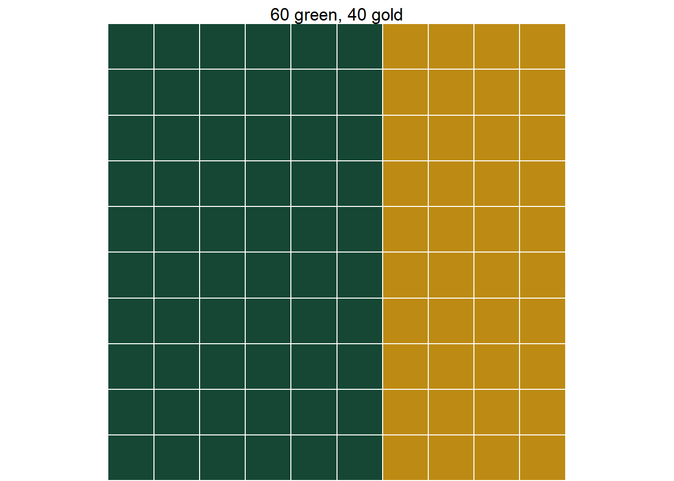 You can only run into problems if you round. Suppose we had started with a group size of 100. Then the top left cell in the table would have been 26.56. If we had rounded this to 27, our answers would change. So when dealing with a hypothetical table of counts, don’t round. If you are uncomfortable with decimal counts, just add a few zeros to your total count and try again↩︎