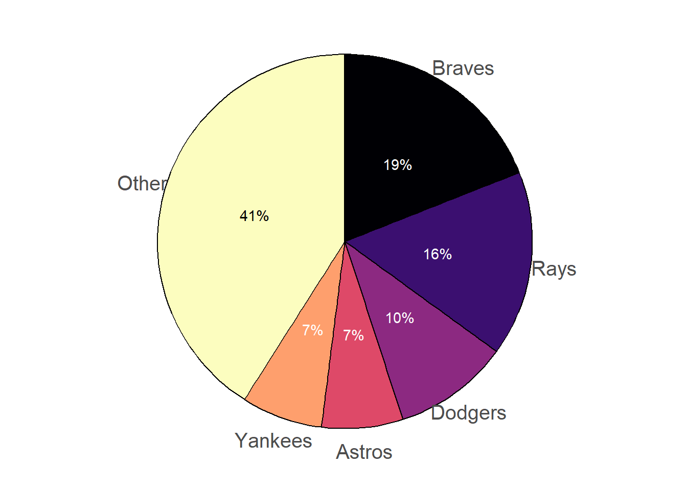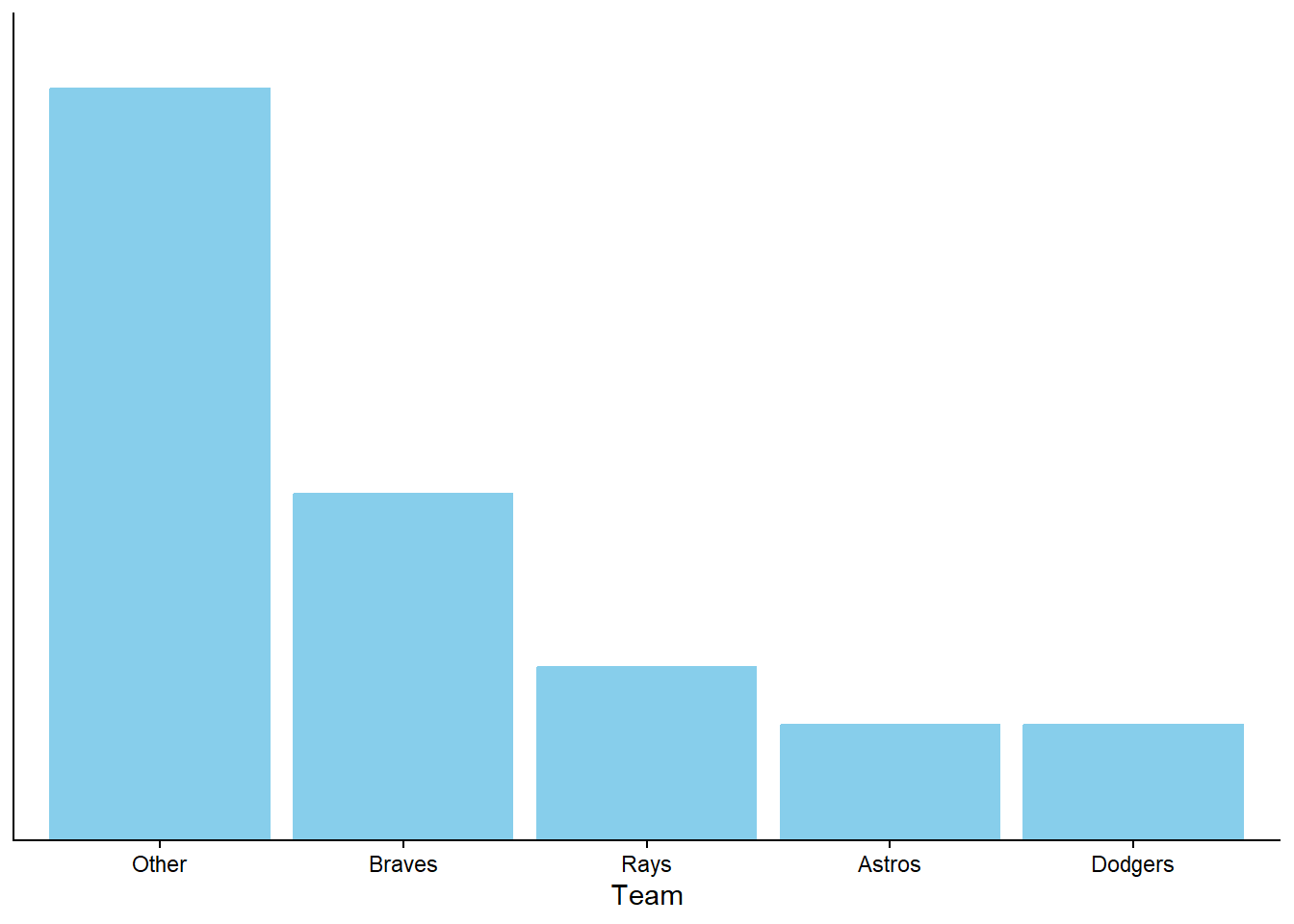 We can also solve this problem using algebra. Let \(x\) be the probability, as a decimal, that the Astros are the winner. (Again, it doesn’t matter which team is the baseline.) Then \(x\) is also the probability that the Dodgers are the winner, \(1.5x\) for the Rays, and \(3x\) for the Braves. The probability that one of the four teams wins is \(x + x + 1.5x + 3x = 6.5x\), so the probability of Other is also \(6.5x\). The probabilities in decimal form must sum to 1, so \(1 = x + x + 1.5x + 3x + 6.5x = 13x\). Solve for \(x=1/13\) and then plug in \(x=1/13\) to find the other probabilities; e.g., \(3x = 3(1/13) = 0.231\) for the Braves.↩︎