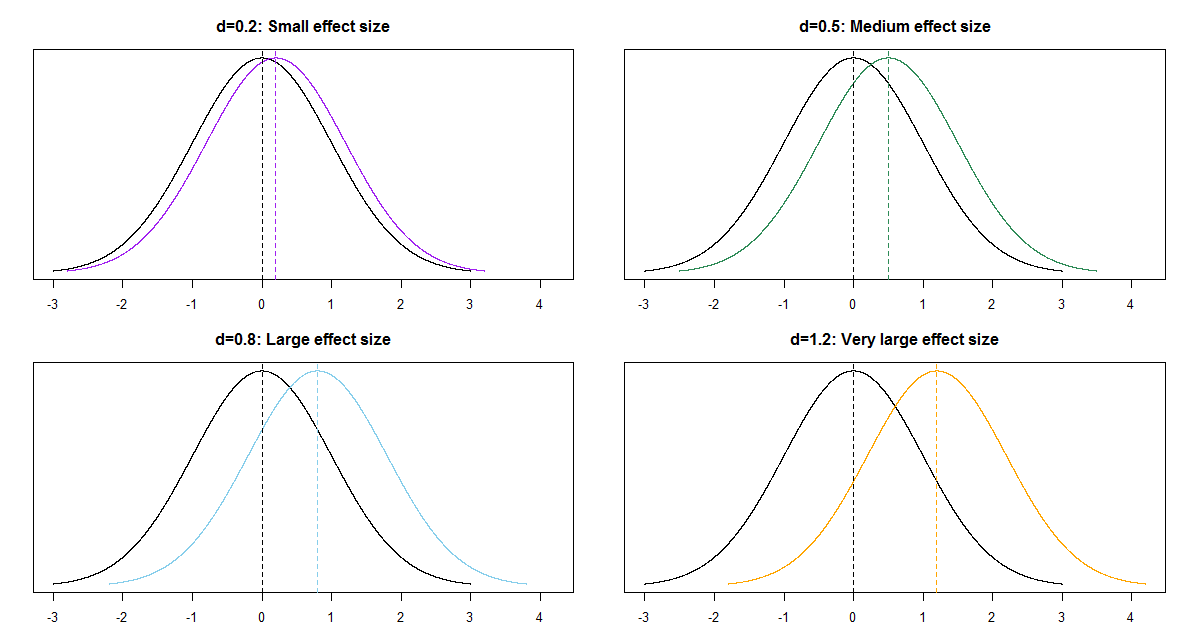 For example, assume the two population distributions are Normal and the two population standard deviations are equal. Then when the effect size is 1.0 the median of the distribution with the higher mean is the 84th percentile of the distribution with the lower mean, which is a very large difference.