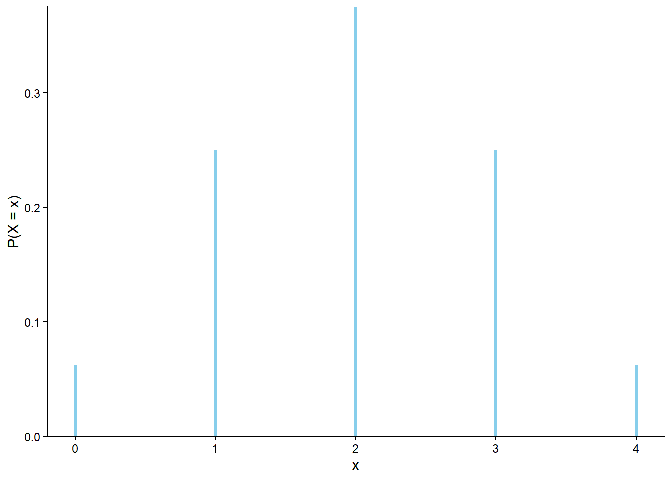 Figure 7.1: The marginal distribution of \(X\), the number of H in 4 flips of a fair coin.