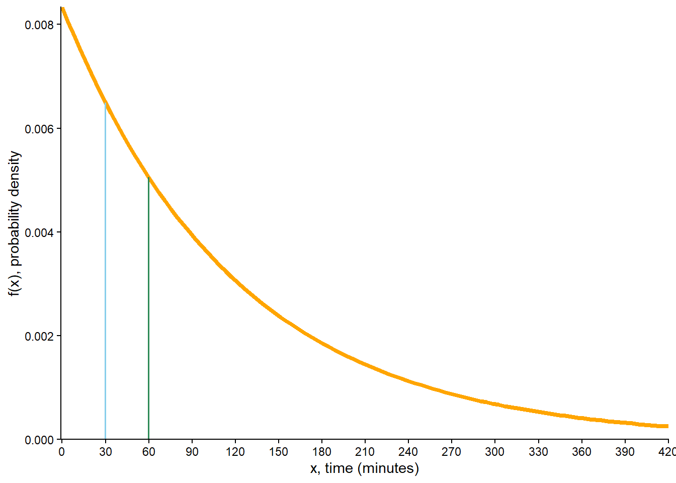 \] On about 53% of days the first person to arrive has to wait more than 15 minutes for the second to arrive.