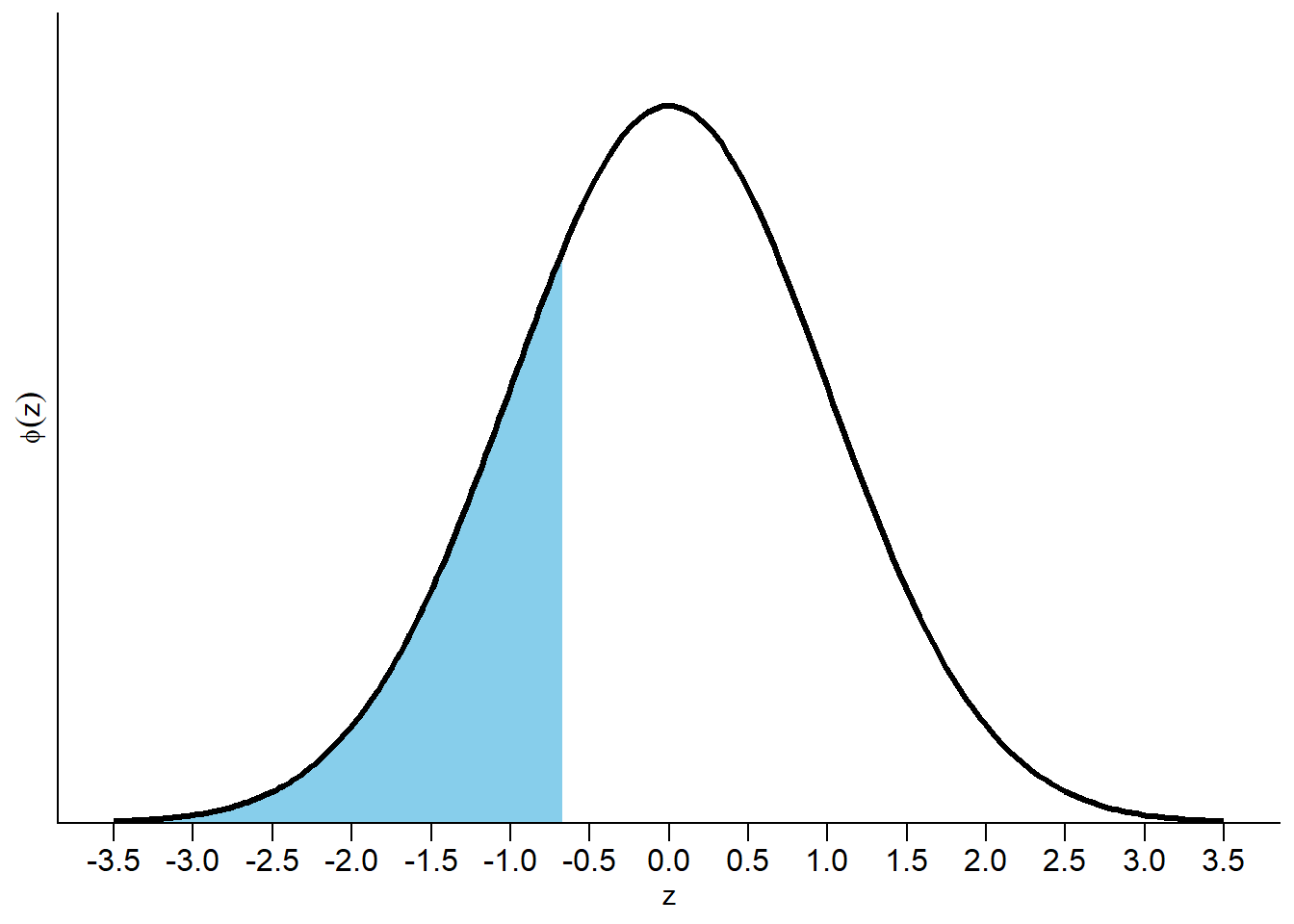 (a) Normal(0, 1) pdf \(\phi(z)\); shaded area represents \(\Phi(-0.67) = 0.25\)
