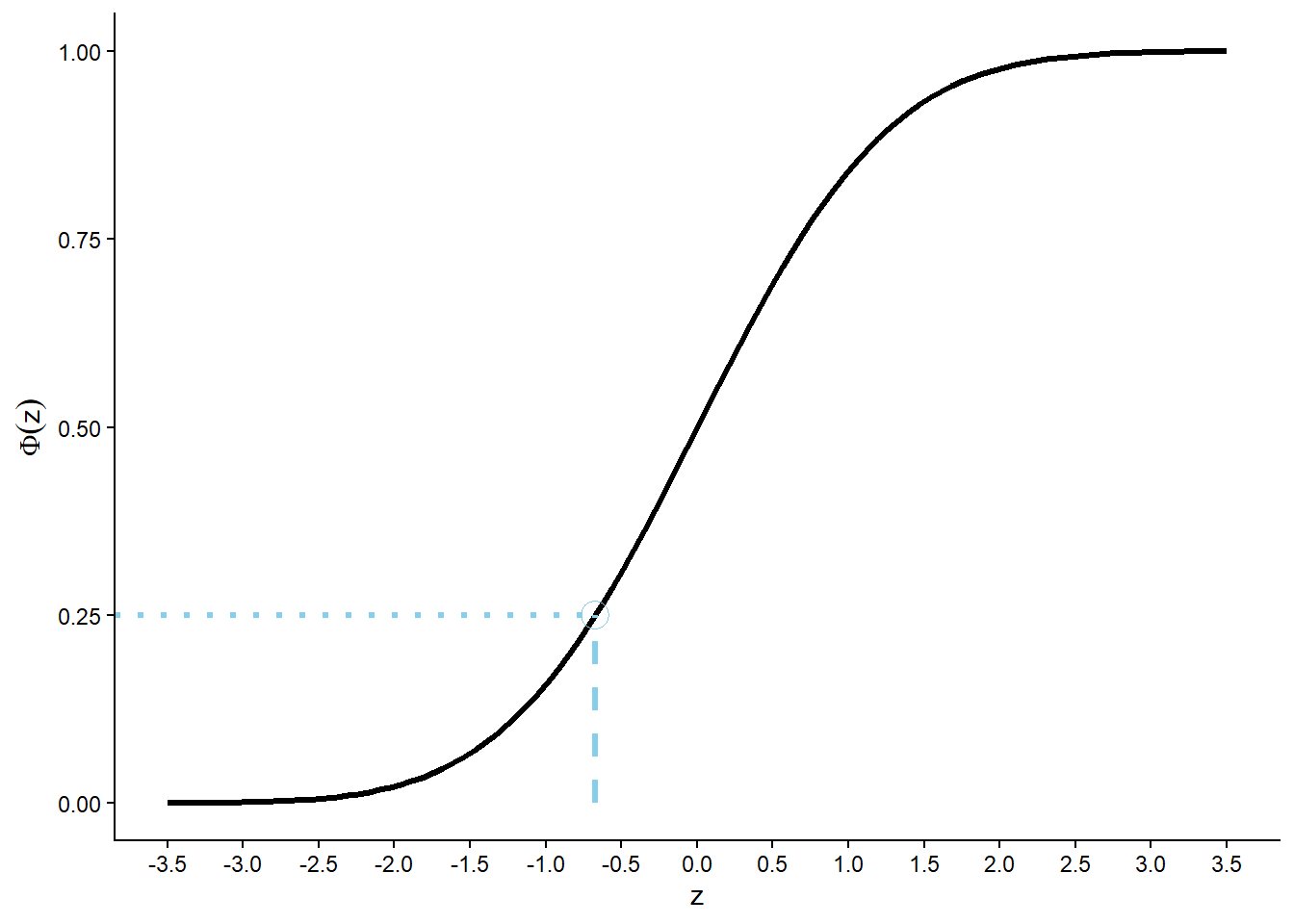 (b) Normal(0, 1) cdf \(\Phi(z)\); \(\Phi(-0.67) = 0.25\) is highlighted