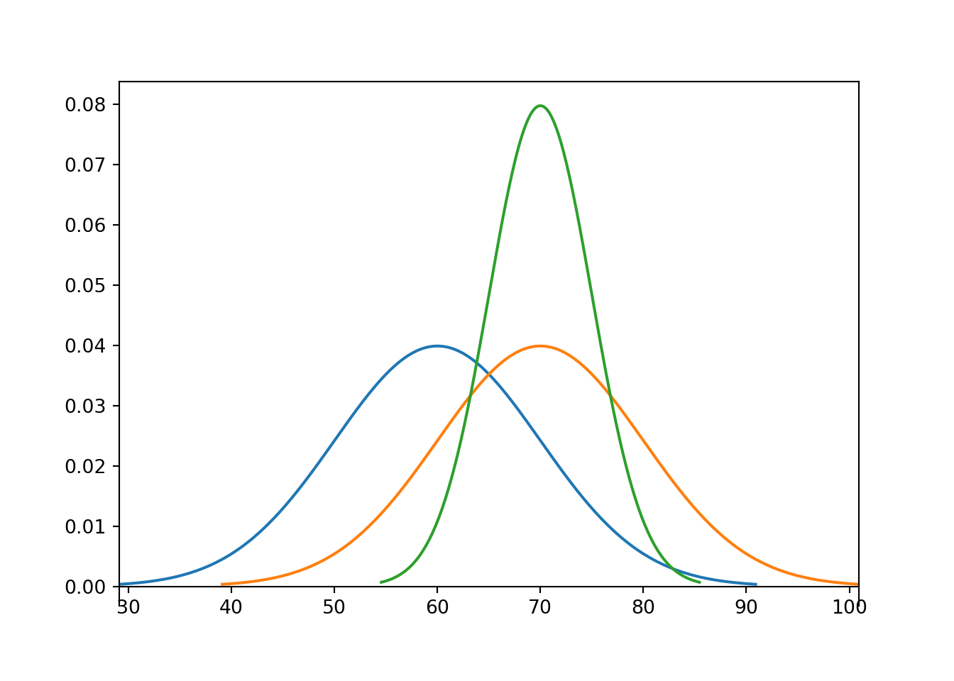 Solution 7.19. The blue curve corresponds to a mean of 60; the others to a mean of 70. The green curve corresponds to a standard deviation of 5. Notice that the concavity changes around 65 and 75, so 5 is the distance from the mean to the inflection points. The standard deviation is 10 in the other plots. The total area under each curve is 1.