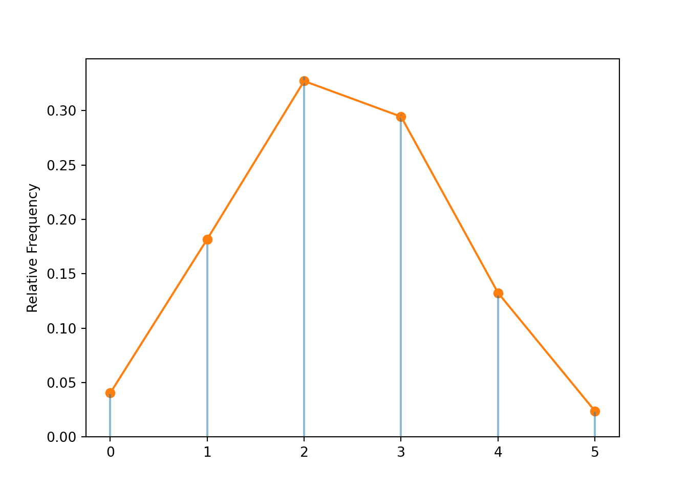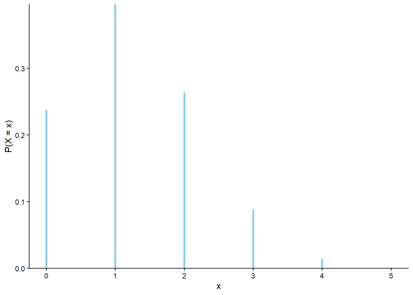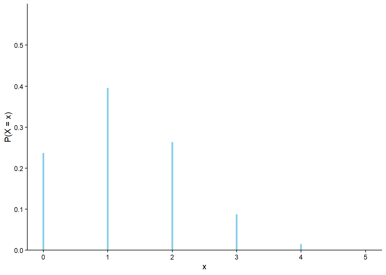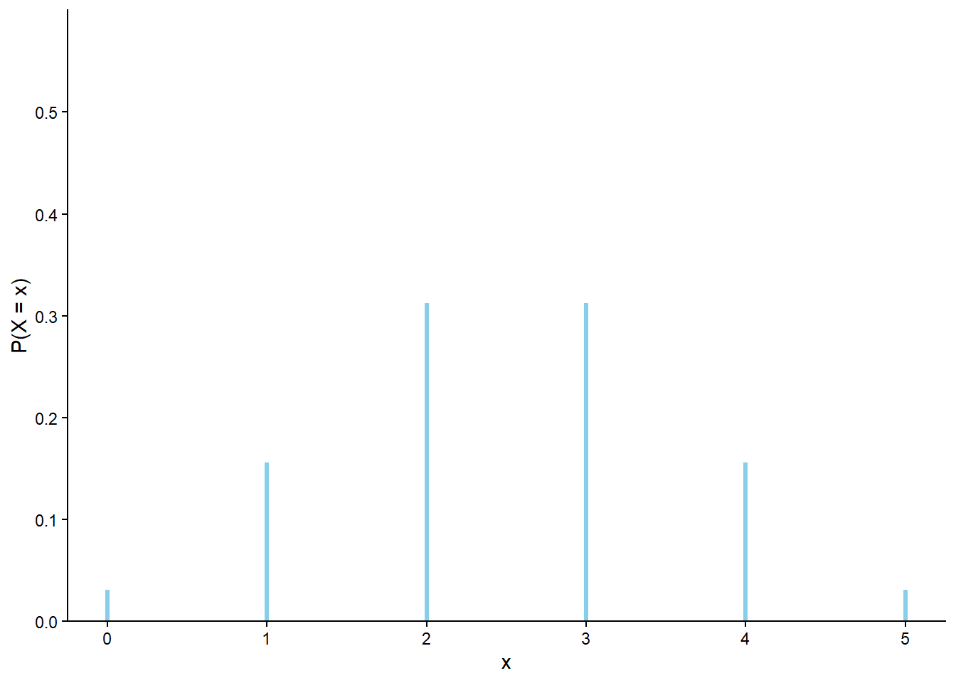 Simulate many values of \(X\) (say 10000) and find the simulated relative frequency of each possible value: \(0, 1, 2, 3, 4, 5\).