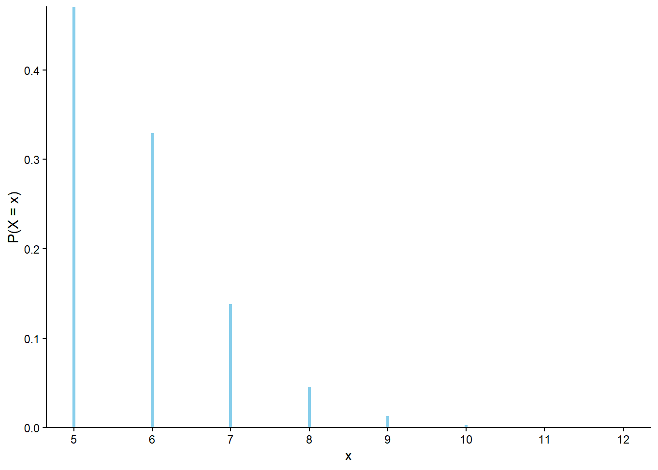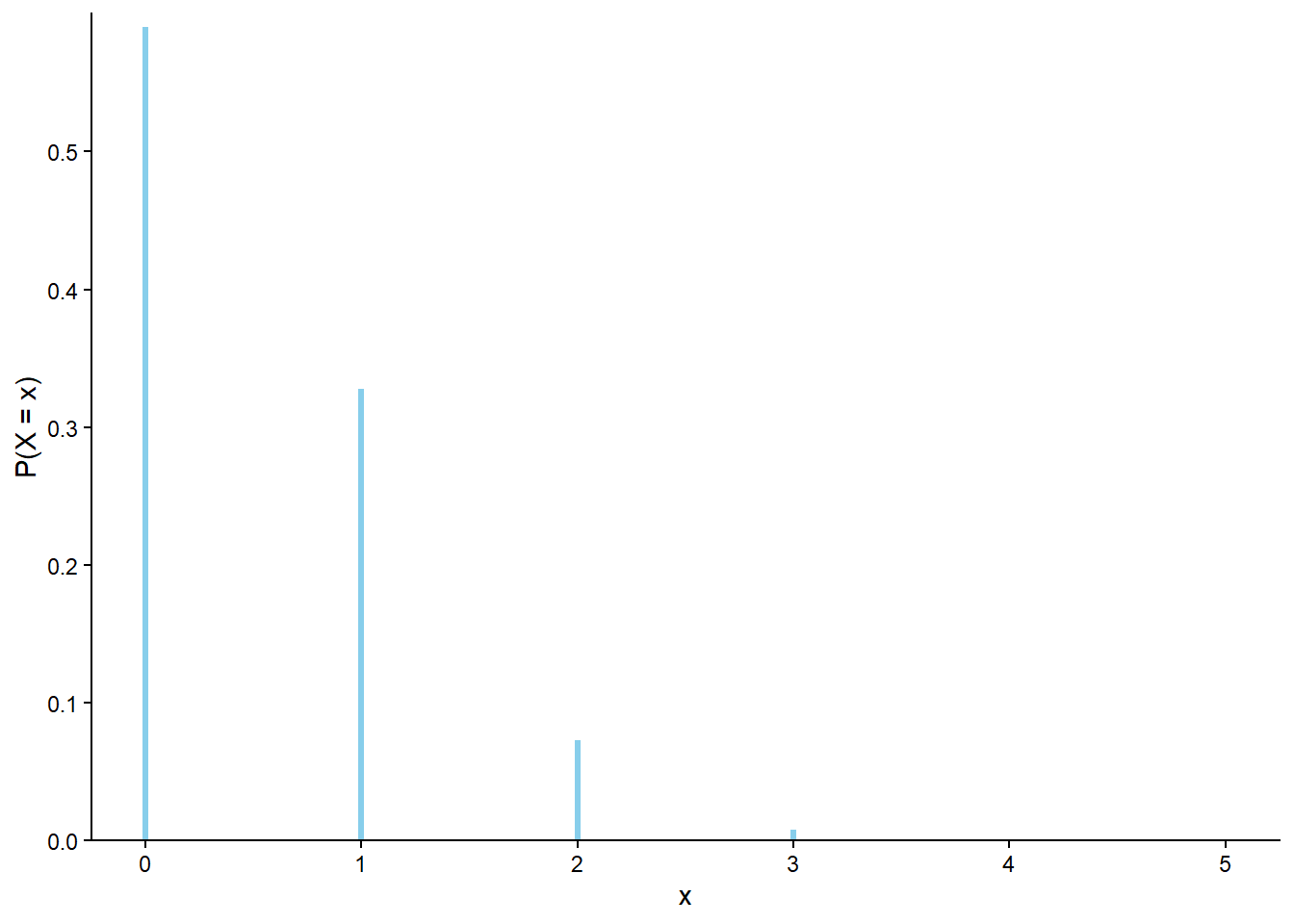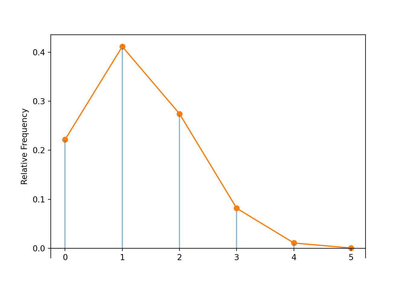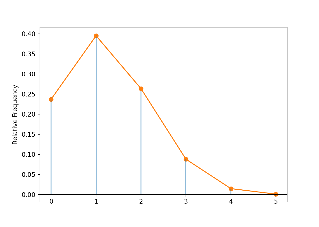 Simulate many values of \(X\) (say 10000) and find the simulated relative frequency of each possible value: \(0, 1, 2, 3, 4, 5\).