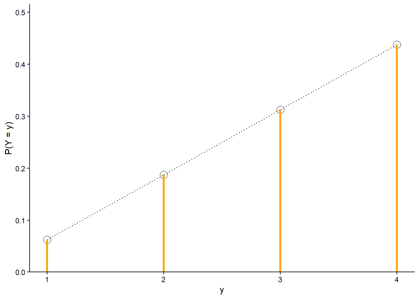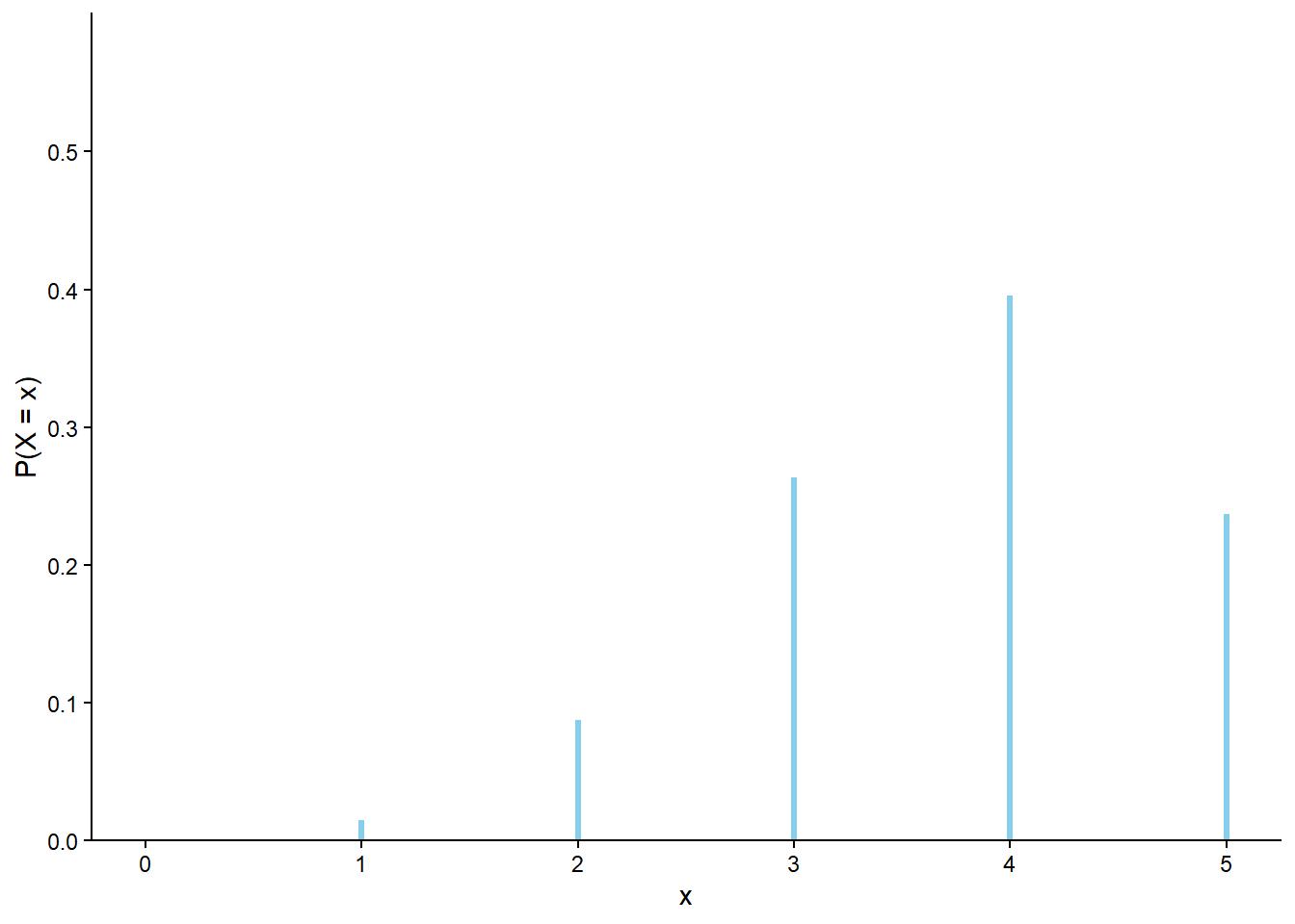 Table 4.1: Table representing the the Binomial(5, 0.25) distribution, the theoretical distribution of \(X\) in Example 4.1.