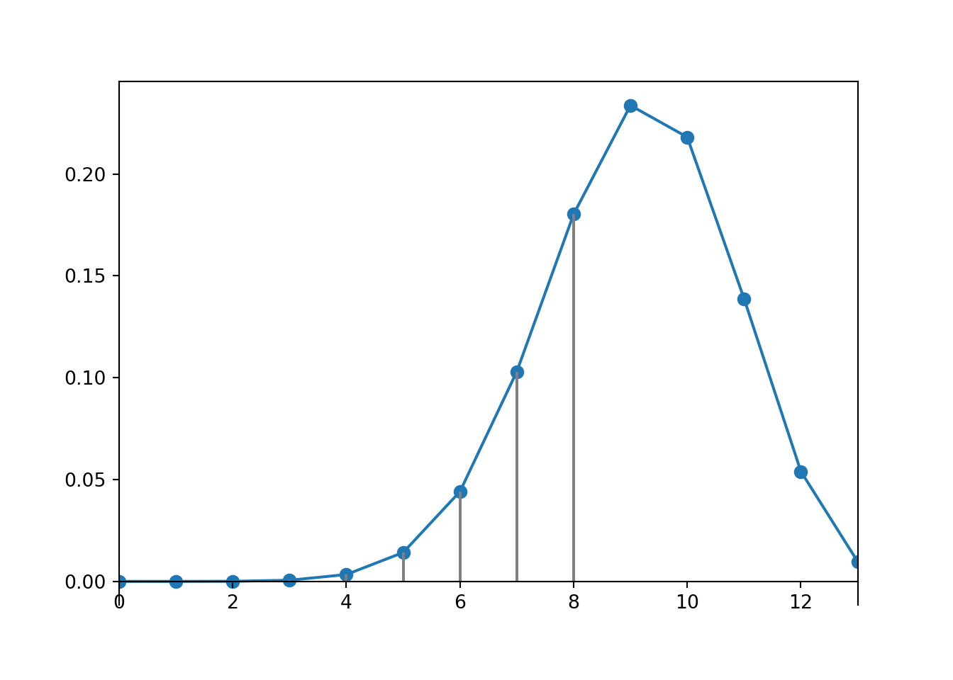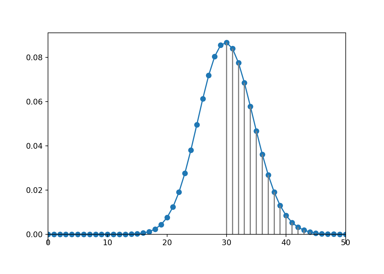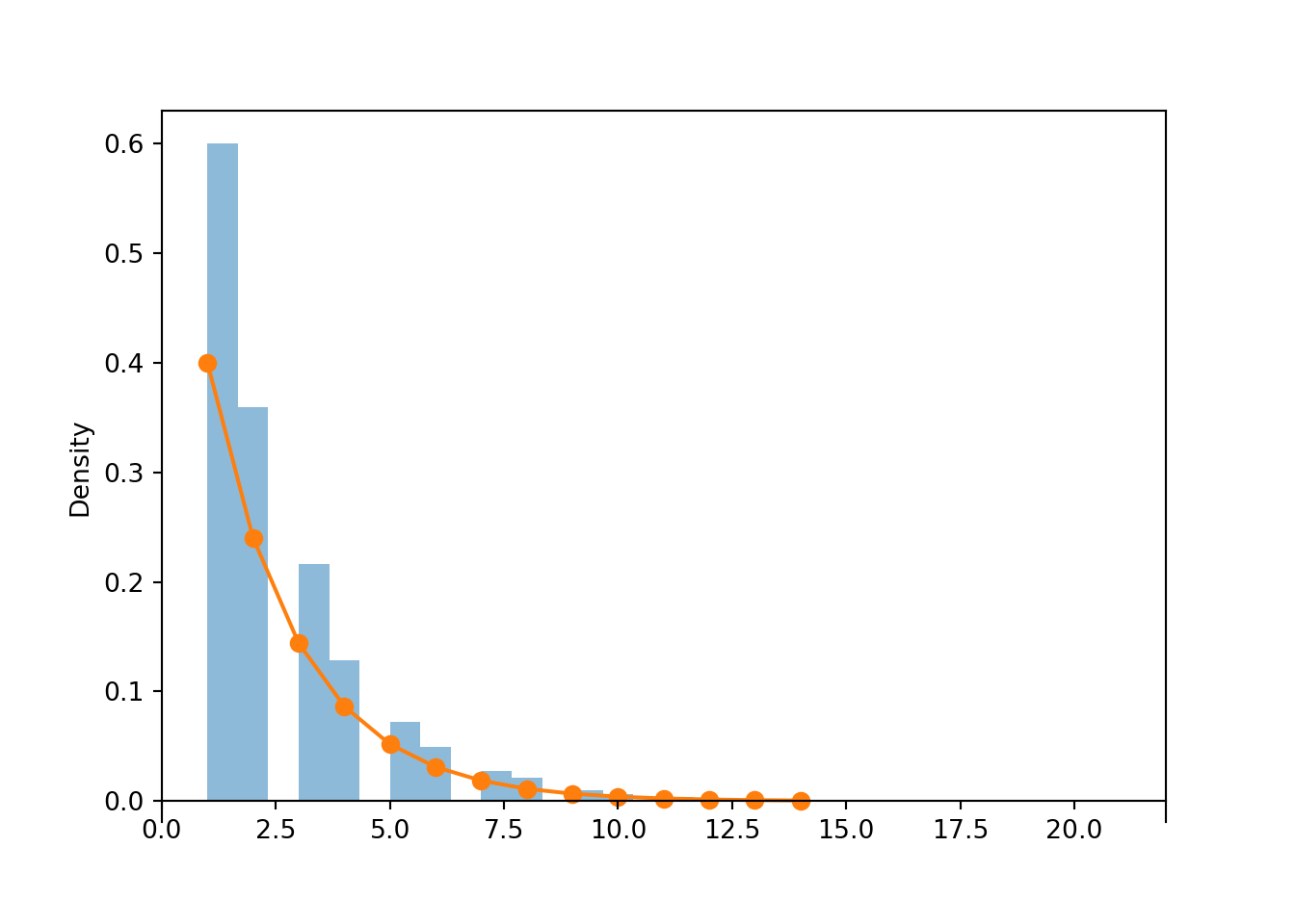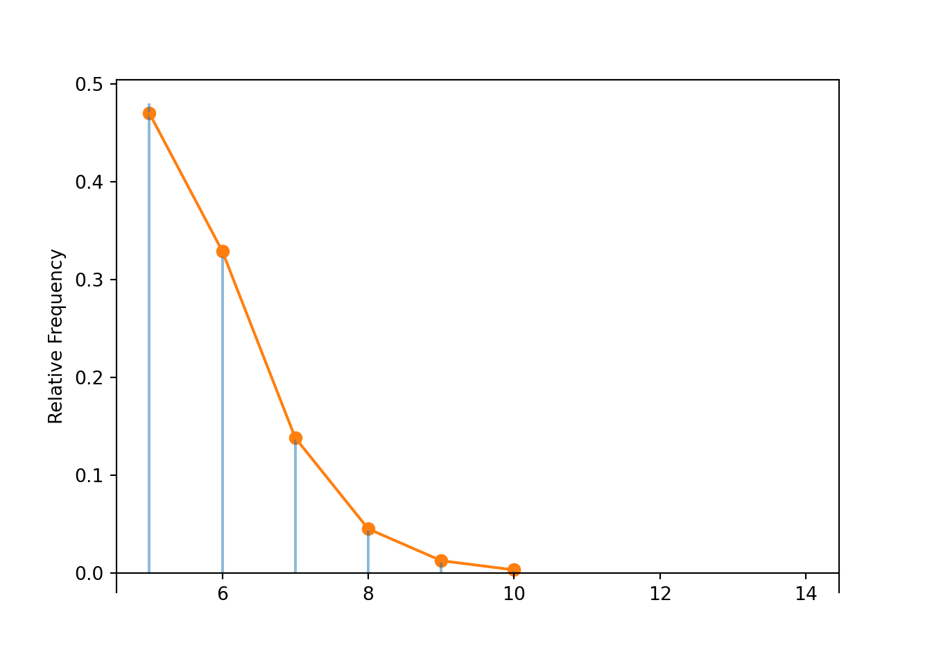 P = BoxModel({1: 13, 0: 39}, size =5, replace =False)X = RV(P, sum)x = X.sim(10000)plt.figure();x.plot();# plot the simulated valuesHypergeometric(N1 =13, N0 =39, n =5).plot();# overlay theoretical pmf