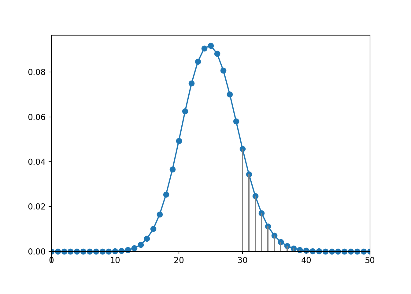 In this scenario, 23.7% of possible samples of 5 butterflies contain 0 tagged butterflies.