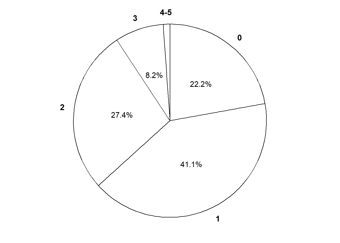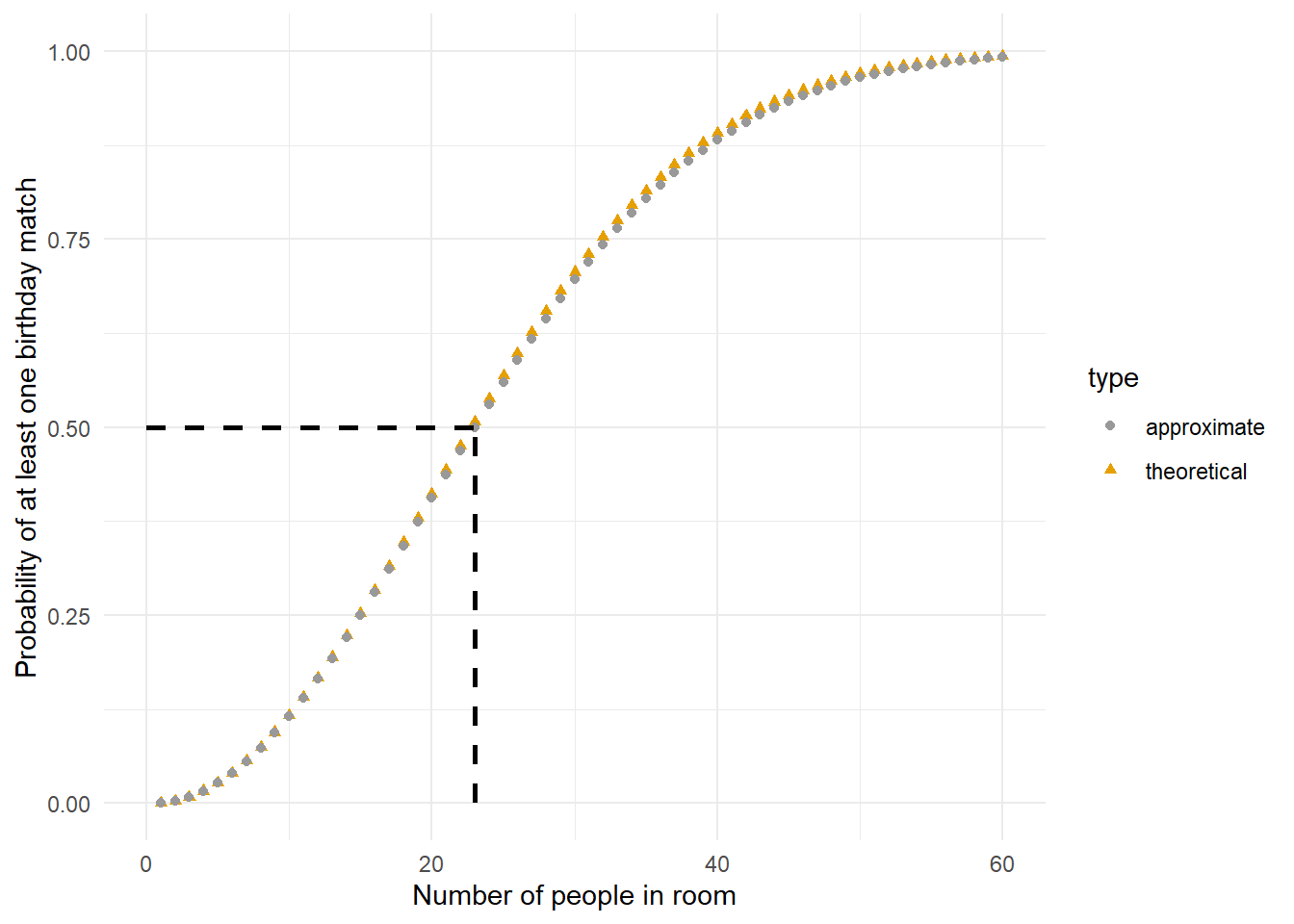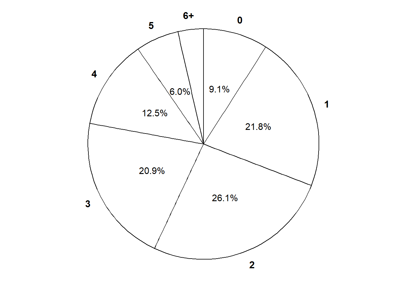 The theoretical value of \(\textrm{P}(X = 0)\) is 0.237. (We will see how to compute this later.) Compare to your simulated value. Is the theoretical value within the margin of error of the simulated value?