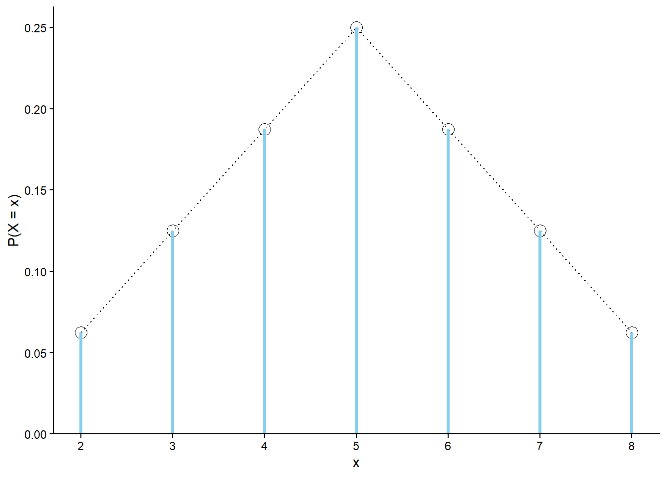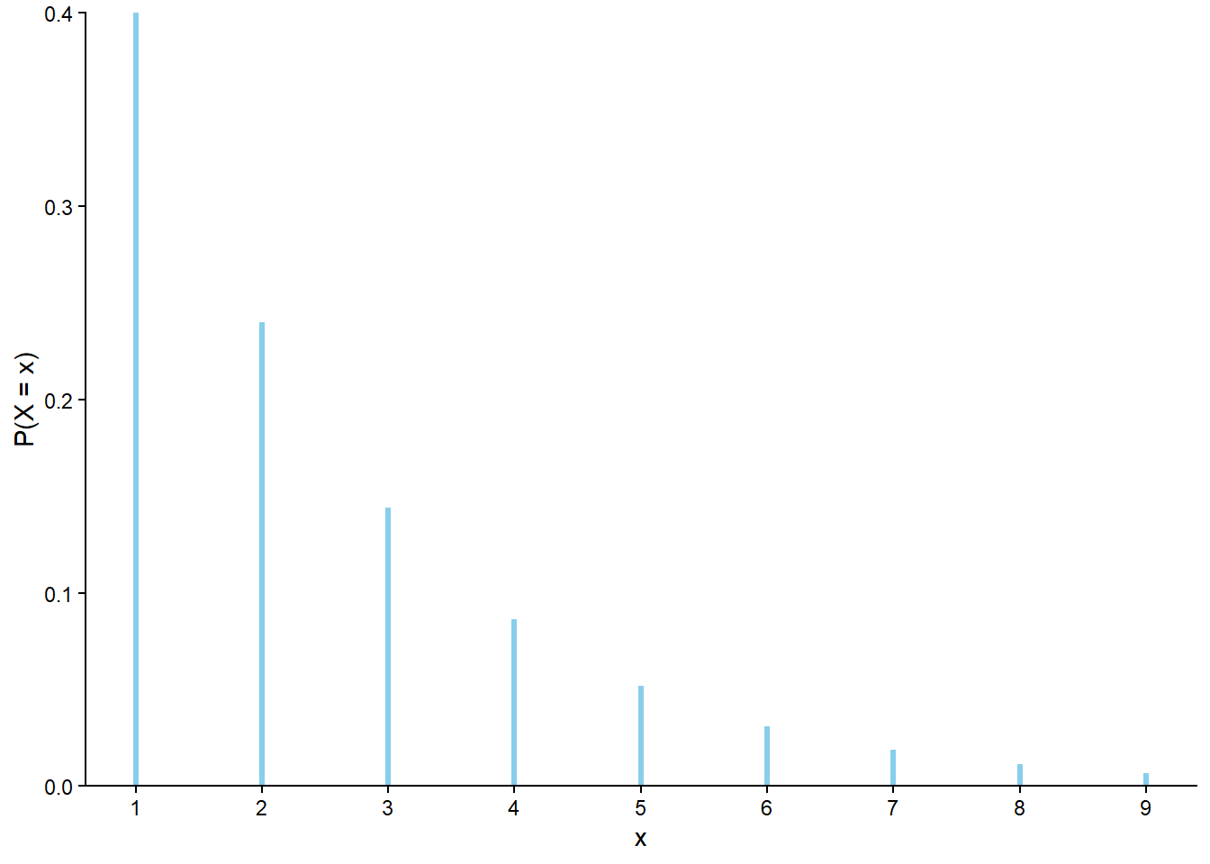 Compare to Table 4.6 and Figure 4.16. These represent the theoretical distribution of \(X\), but your simulation-based approximation should be similar (see our Symbulate output below).