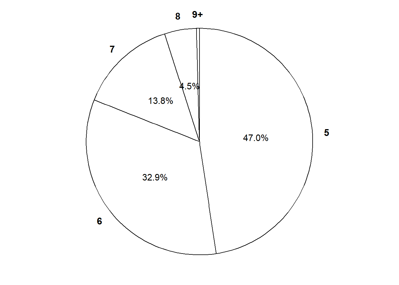 \(X\) is the number of tagged butterflies in the sample of 5, so the largest \(X\) can be is 5 and the smallest \(X\) can be is 0. (Don’t forget 0.) The possible values of \(X\) are 0, 1, 2, 3, 4, 5.