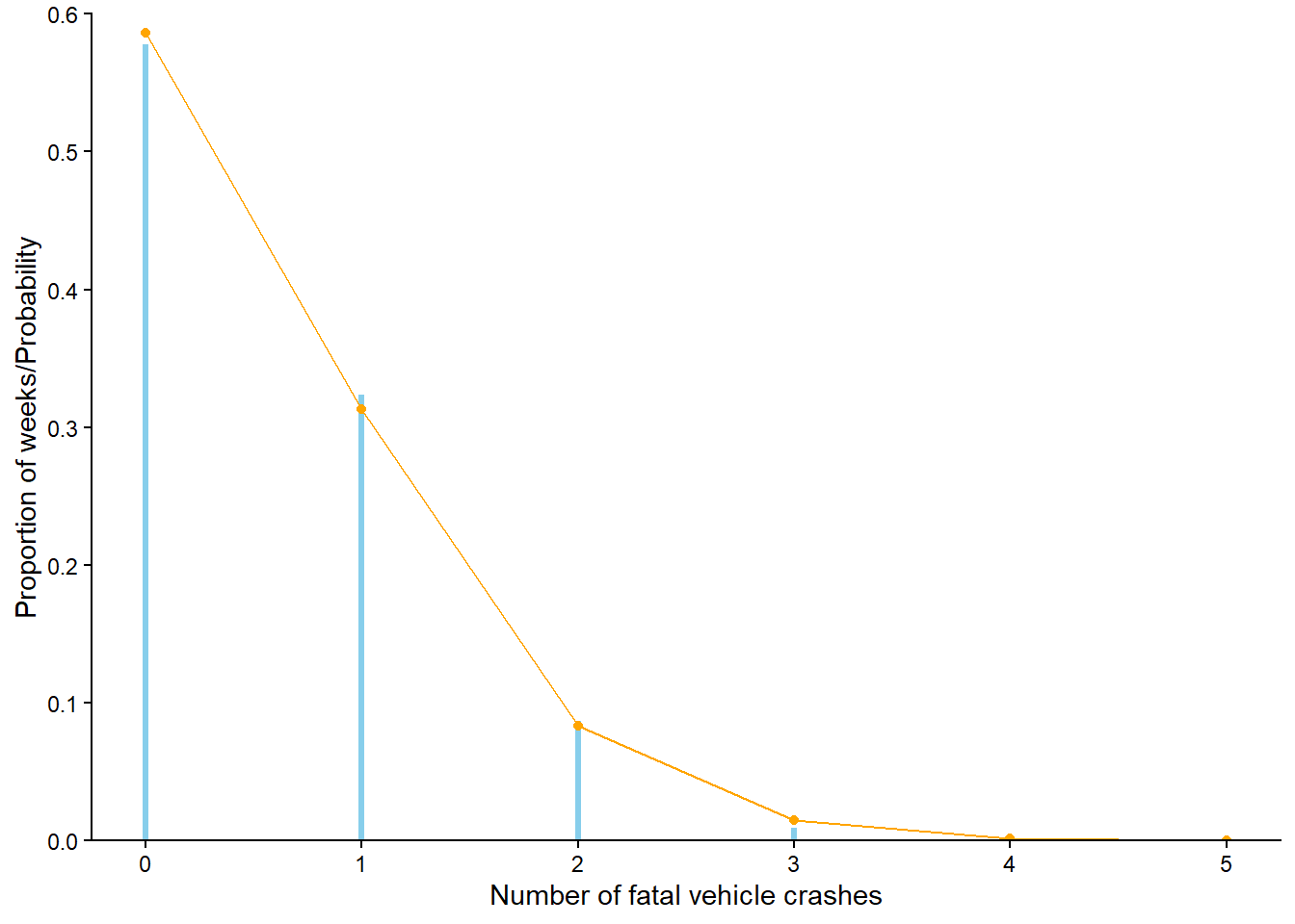 Exercise 4.1 Let \(X\) be the number of vehicles crashes involving fatalities that occur in San Luis Obispo County in a randomly selected week. Assume that \(X\) follows a Poisson(0.53) distribution.