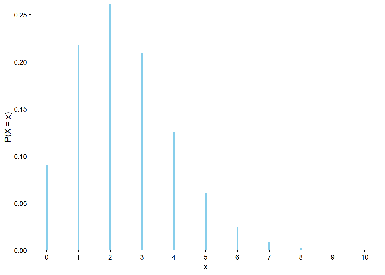 \] where \(\binom{n}{x} = \frac{n!}{x!(n-x)!}\). For example, if \(n=5\) and \(p = 0.25\), \(p(2) = \binom{5}{2}(0.25)^2(1-0.25)^{5-2} = 0.264\). We will derive this pmf later.↩︎