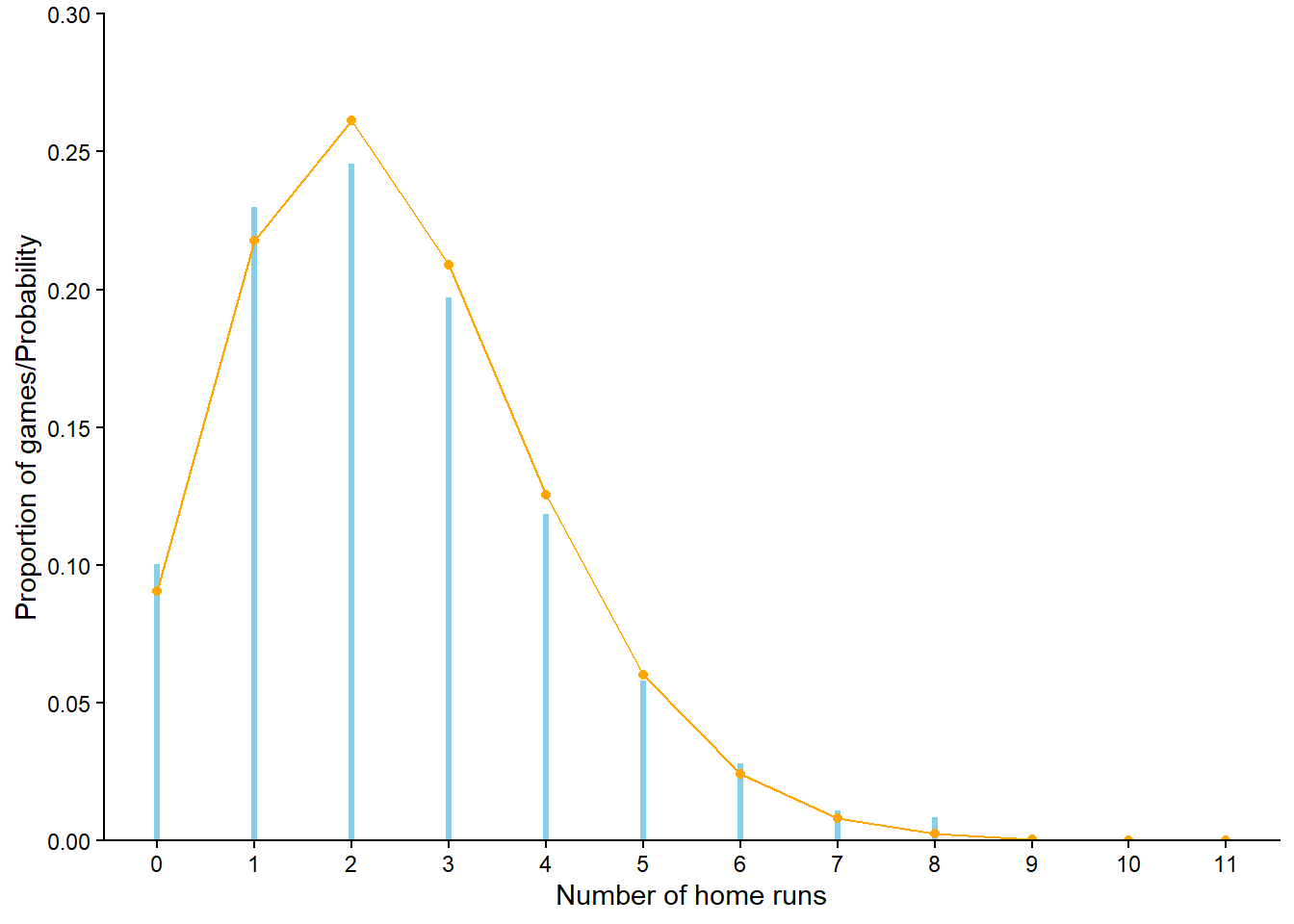 As long as the \(p_i\) are comparably small, we only need to know the sum \(p_1 +\cdots +p_n\) and not the individual \(p_i\)’s’ to apply the Poisson approximation. We can estimate \(\textrm{E}(N) = p_1+\cdots+p_n\) directly by collecting data on observed counts (like in Figure 4.13 and Figure 4.14) without having to estimate individual \(p_i\)’s.’