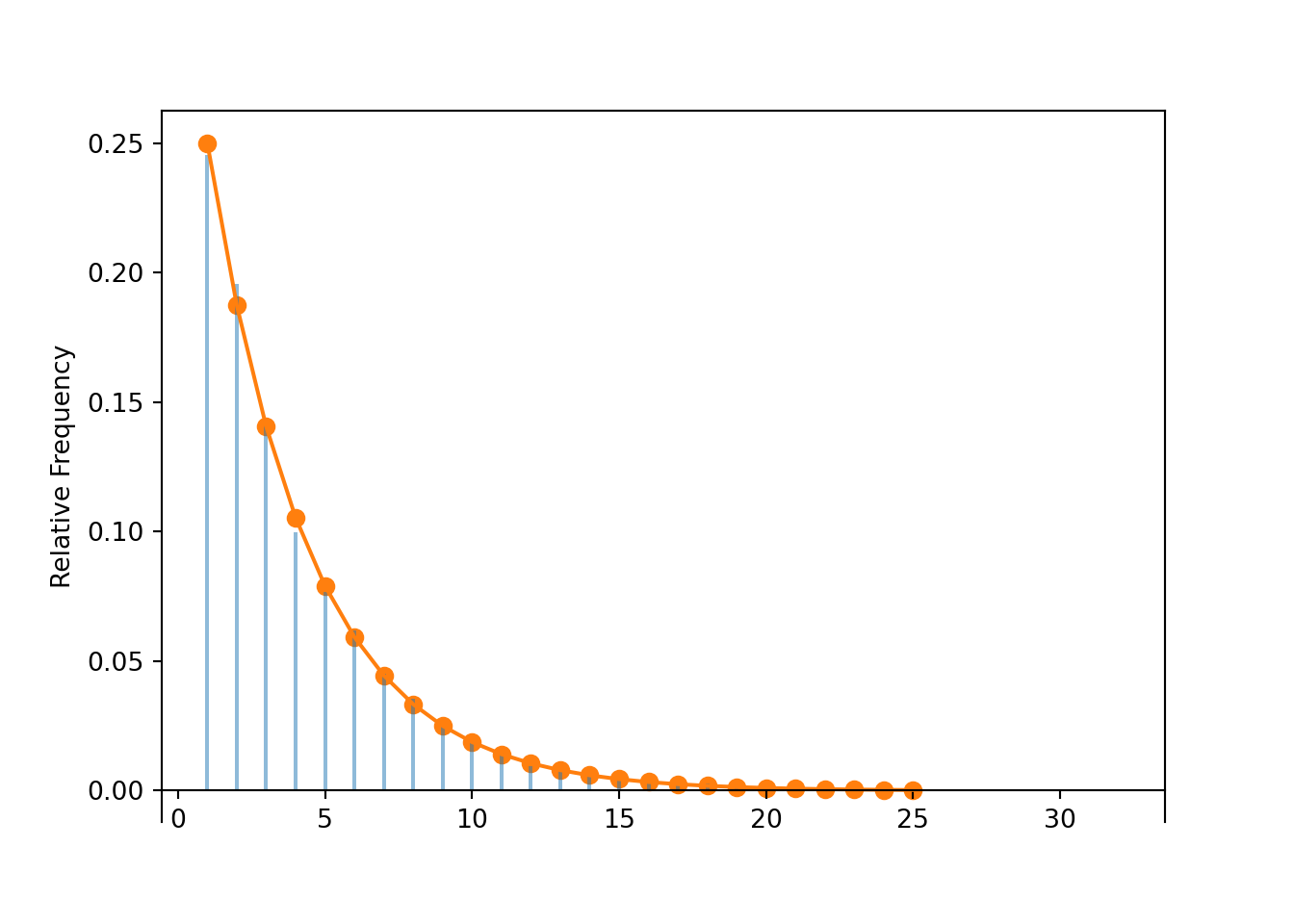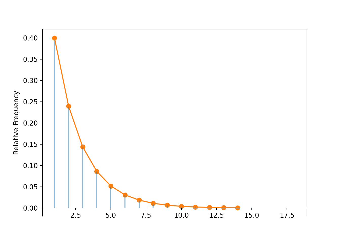 Repeat the steps in part 2 many times to simulate many values of \(X\), say 10000. Count the number of repetitions that result in \(X=0\) and divide by the total number of repetitions (10000); this relative frequency approximates \(\textrm{P}(X = 0)\).