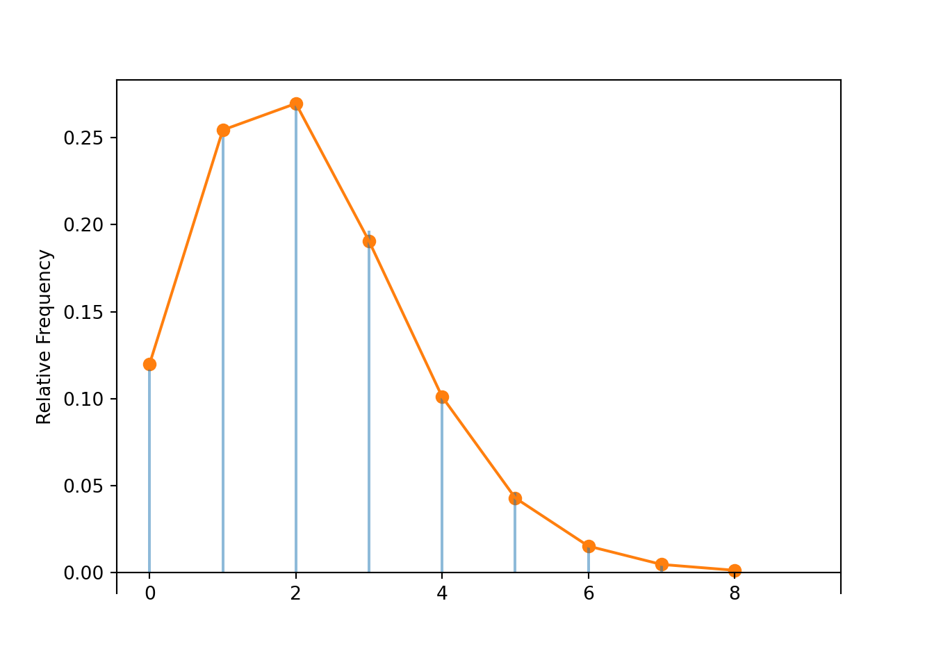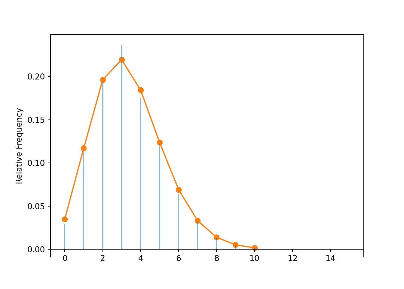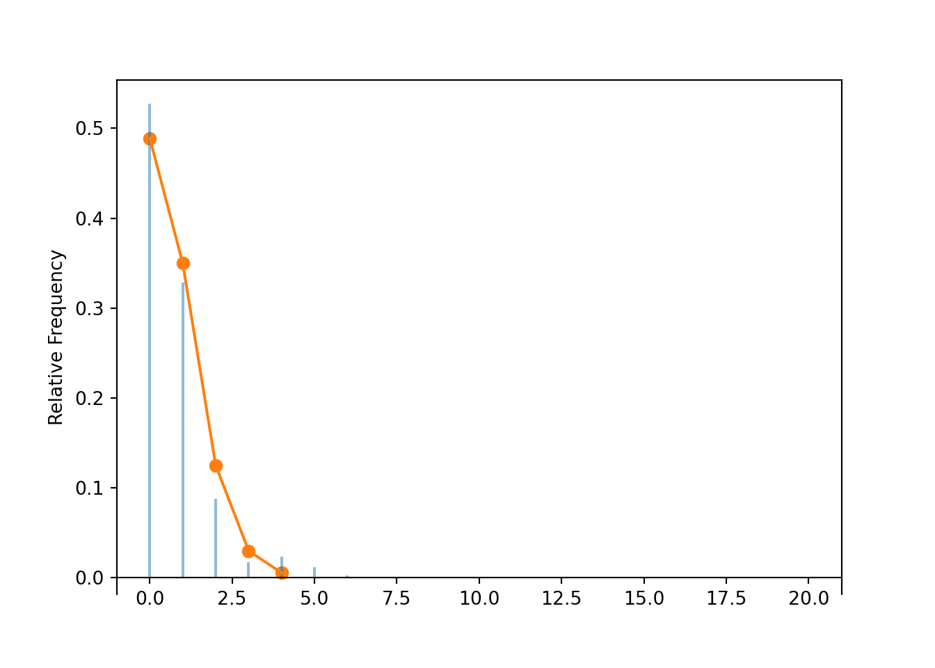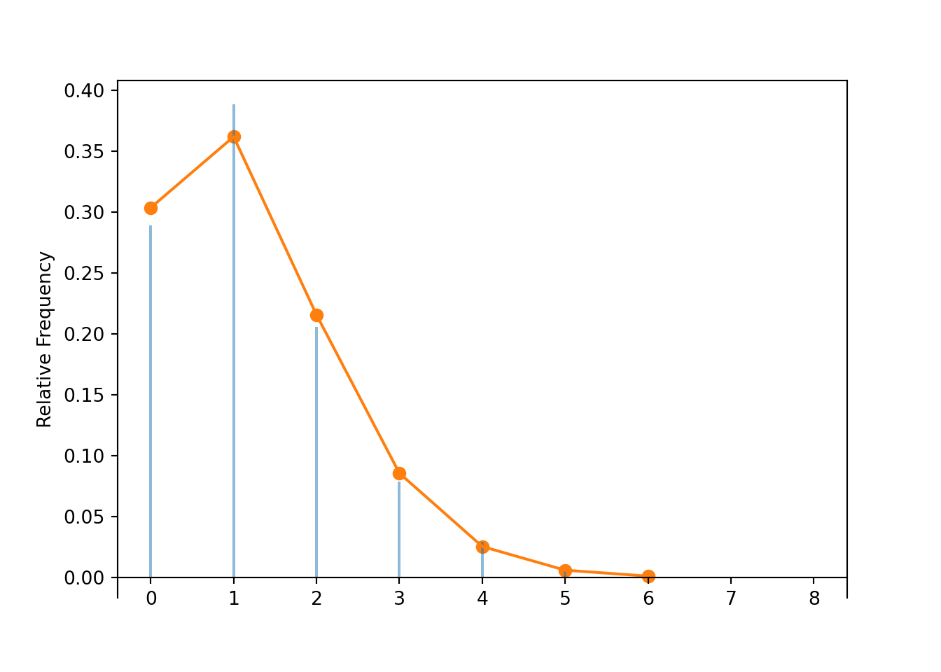 Approximate \(\textrm{P}(X = 0)\) with the relative frequency of 0; compare to the theoretical value 0.237.
